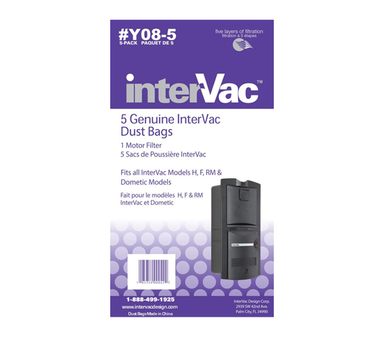 Package of 5 genuine InterVac brand dust bags for RV central vacuum systems. Model Y08-5. Fits all InterVac models H, F, RM & Dometic Models. Also includes 1 motor filter.