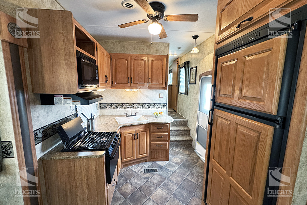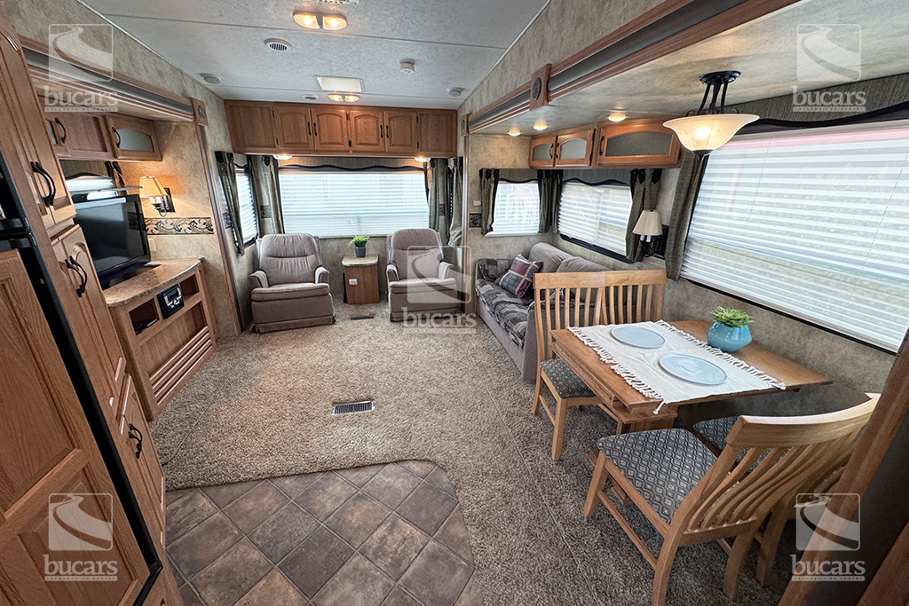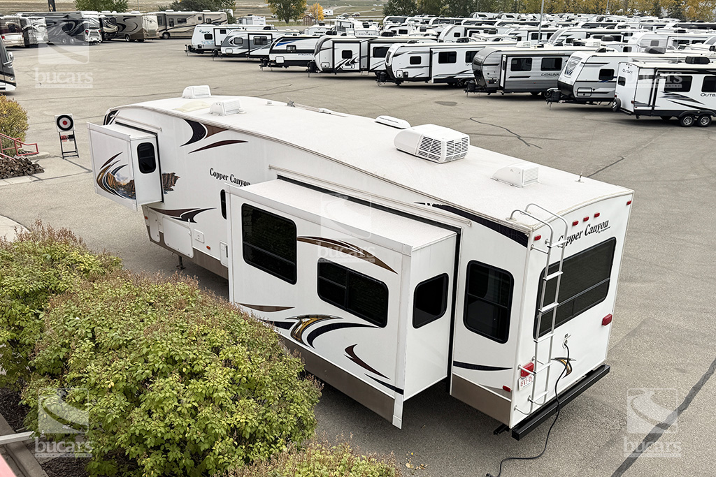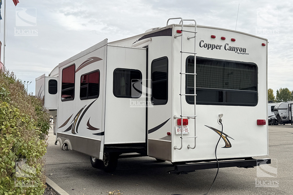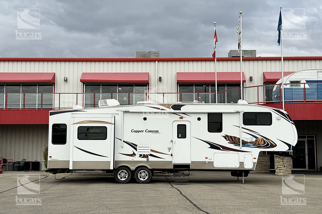 This 2011 Keystone Copper Canyon 314FWRL is a well-appointed fifth wheel measures in at 36 feet long and has 3 slideouts. This RV has been well-maintained and has plenty of premium features to make your camping trips comfortable. The corner kitchen is conveniently located inside the entrance and features a three-burner cooktop, microwave, double bowl sink, gas/electric refrigerator, ceiling fan, and plenty of storage. The freestanding dinette offers maximum flexibility for seating. And you will love relaxing in the rear living room that has a pull-out sleeper sofa across from the entertainment centre with stereo and hidden TV on lift. The dual recliners in the rear are below the large picture window with plenty of natural light. The bedroom has an upgraded queen mattress, dresser, and wardrobe with mirrored doors. You will be amazed by all of the storage inside and out of this spacious RV. For additional information on this Keystone Copper Canyon, please call or text our main line at 403-207-1666, or come down and see this used fifth wheel for yourself at our Balzac lot just north of Calgary. For after-hour inquiries, please text us at 403-207-1666.