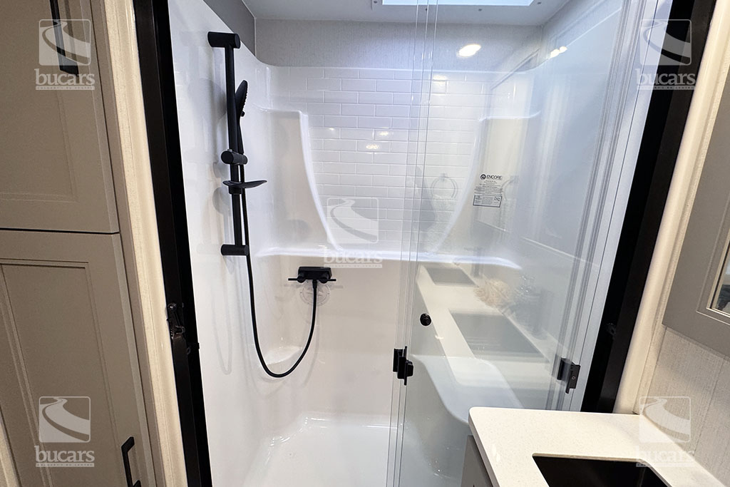 - Residential 1-Piece Fiberglass Shower Stall w/Built-in Seat & Glass Doors