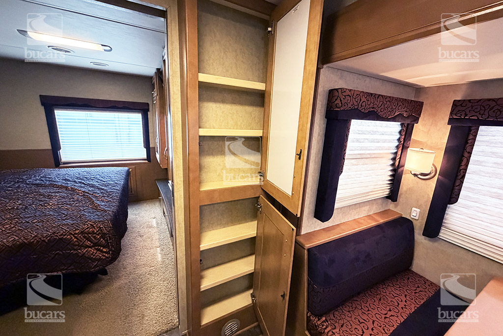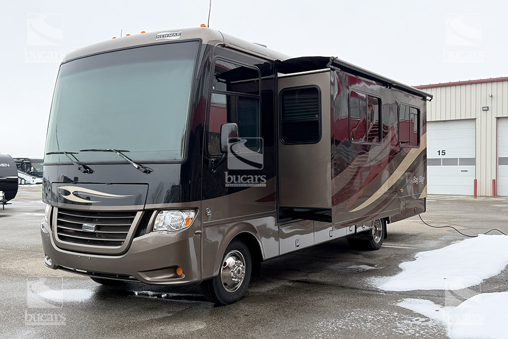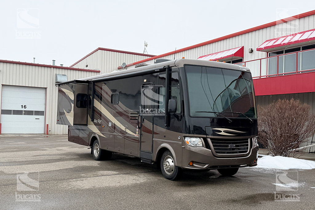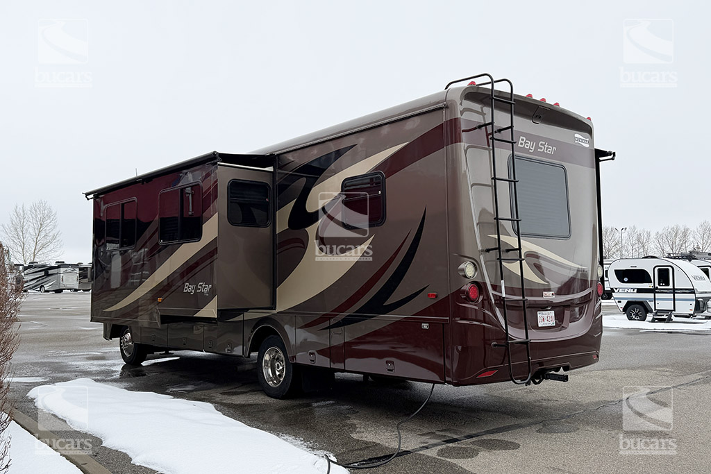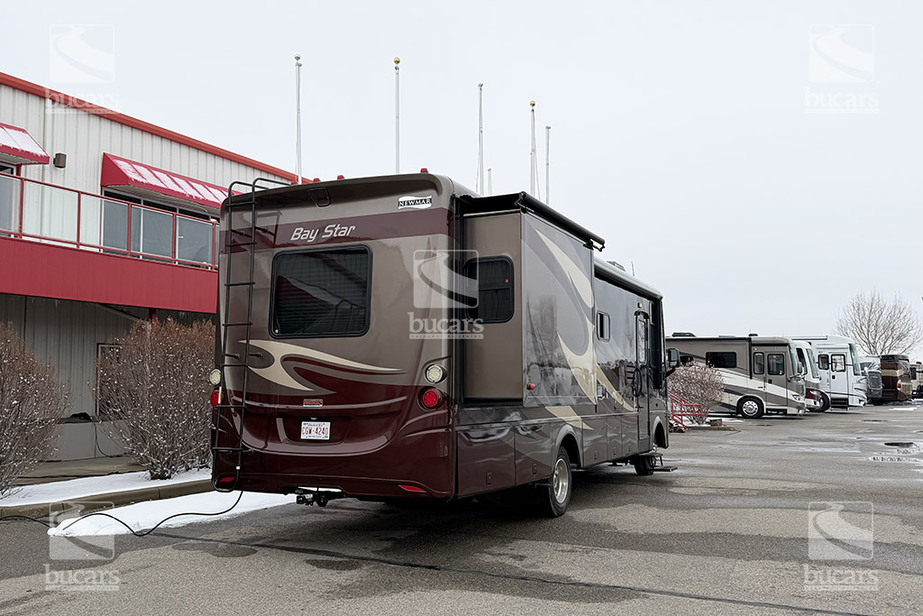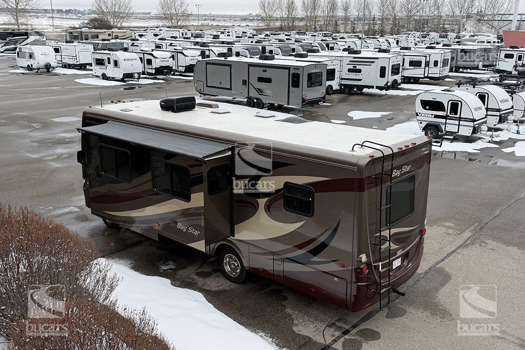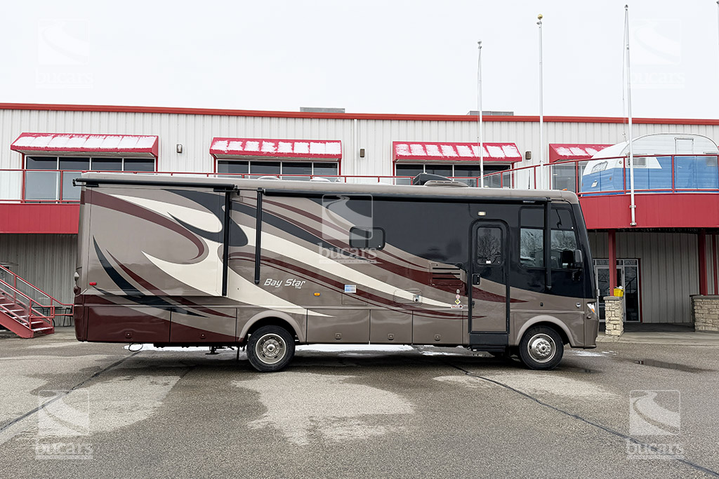 This 2013 Newmar Bay Star 3012 is a lovingly maintained gas-powered Class A Motorhome with plenty of features to make your time on the road comfortable. This beautiful coach features full paint, dual pane windows, auxiliary heater in the bedroom, upgraded R19 insulation, along with heated tanks to extend your camping season. As you enter the coach, you are greeted with a large sleeper sofa with versatile storage ottoman. The well-stocked L-shaped kitchen includes a 3-burner cooktop, 2-way RV refrigerator, microwave, stainless steel sink, and pop-up countertop extension. Across from the kitchen is a cozy dinette that converts to a bed for additional sleeping space. The rear bedroom has plenty of natural light with day/night shade, large wardrobes, television, and spacious king size bed. The central bathroom features a radius glass shower, corner sink, foot flush toilet, and plenty of storage. For additional information on this pre-owned Bay Star, please contact us at 1-800-267-8348, or come down and see this Newmar motorhome for yourself at our Balzac lot just north of Calgary. For after-hour inquiries, please text us at 403-207-1666.