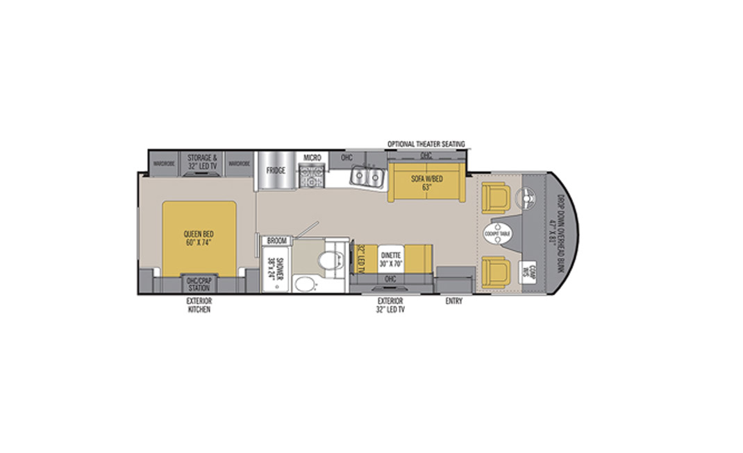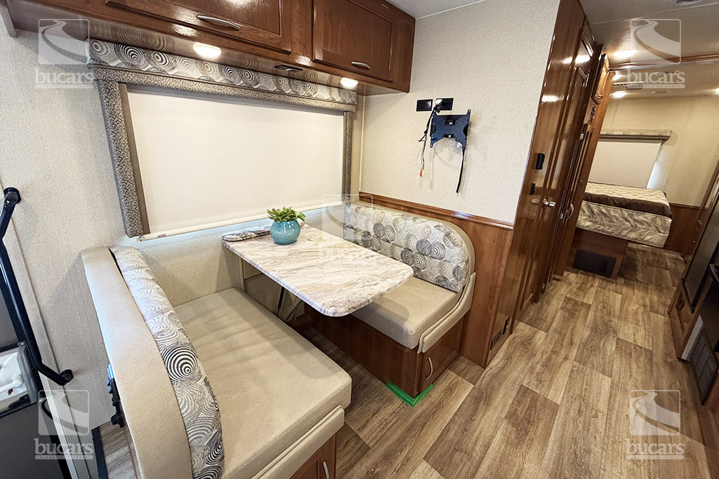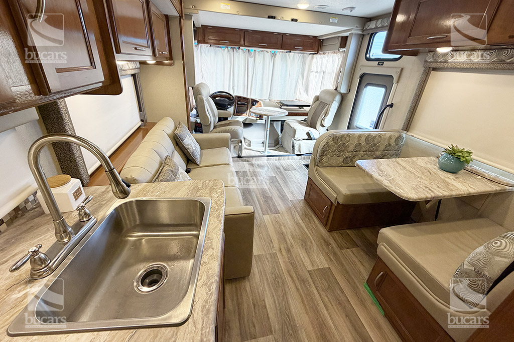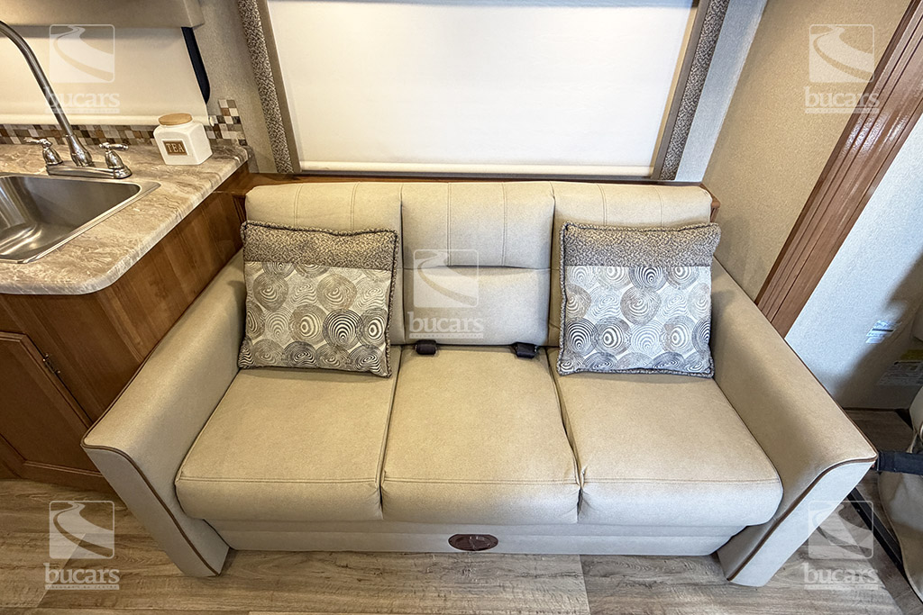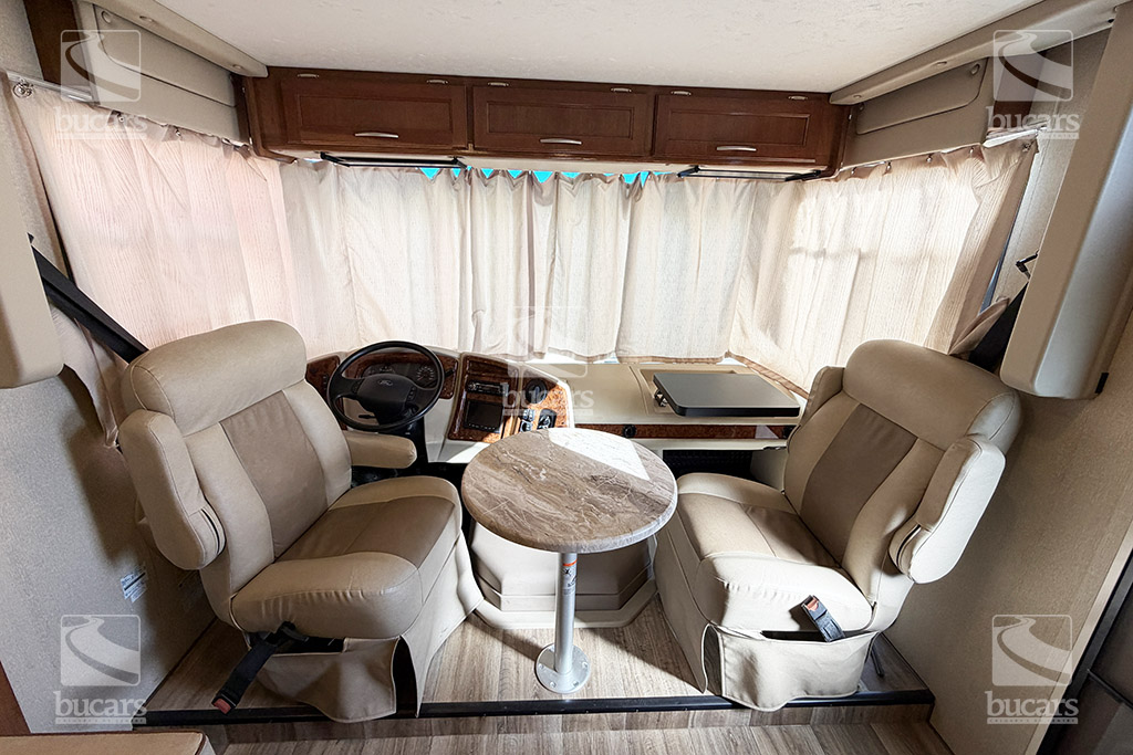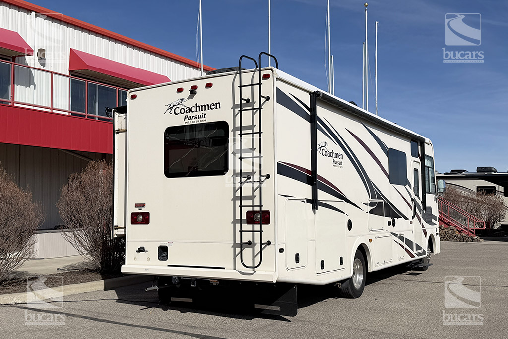 This pre-owned 2019 Coachmen Pursuit Precision 29SSP is a great starter motorhome for those looking to get into a Class A RV. This gas powered motorhome on a Ford F53 has features galore for those craving adventure of the open road including solar power, an exterior TV, and exterior kitchen. This motorhome measures in at just over 30 feet long, and sleeps 6 between the queen bed, pull-out sofa, booth dinette, and power drop-down bunk over the cab. The classic layout features the sofa across from the dinette, with TV mount ready to add your own TV. The galley kitchen has a three-burner cooktop, microwave, stainless steel sink, and an efficient and dependable gas/electric RV fridge. The spacious three-piece bath is centrally located, and lastly the rear bedroom has plenty of storage, natural light, and an additional TV. This Coachmen motorhome has been well-maintained has 50,620 km on the odometer. For additional information on this Coachmen Pursuit Precision 29SSP, please contact us at 1-800-267-8348, or come down and see pre-owned class A motorhome for yourself at our Balzac lot just north of Calgary. For after-hour inquiries, please text us at 403-207-1666.