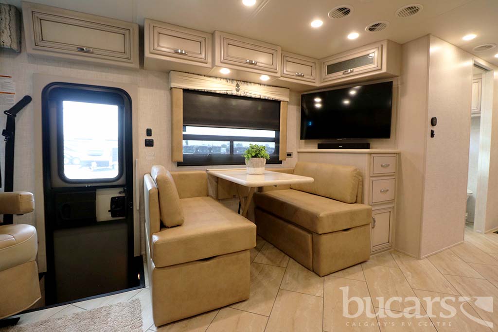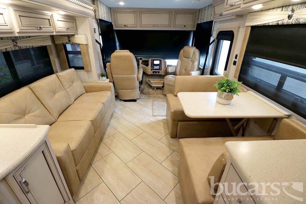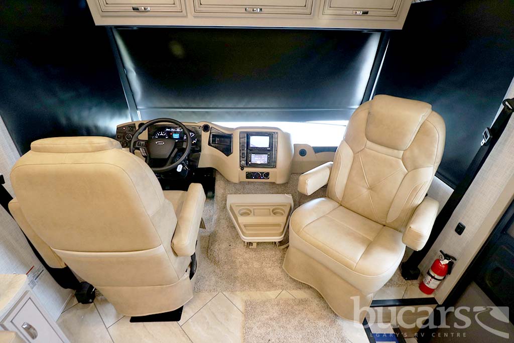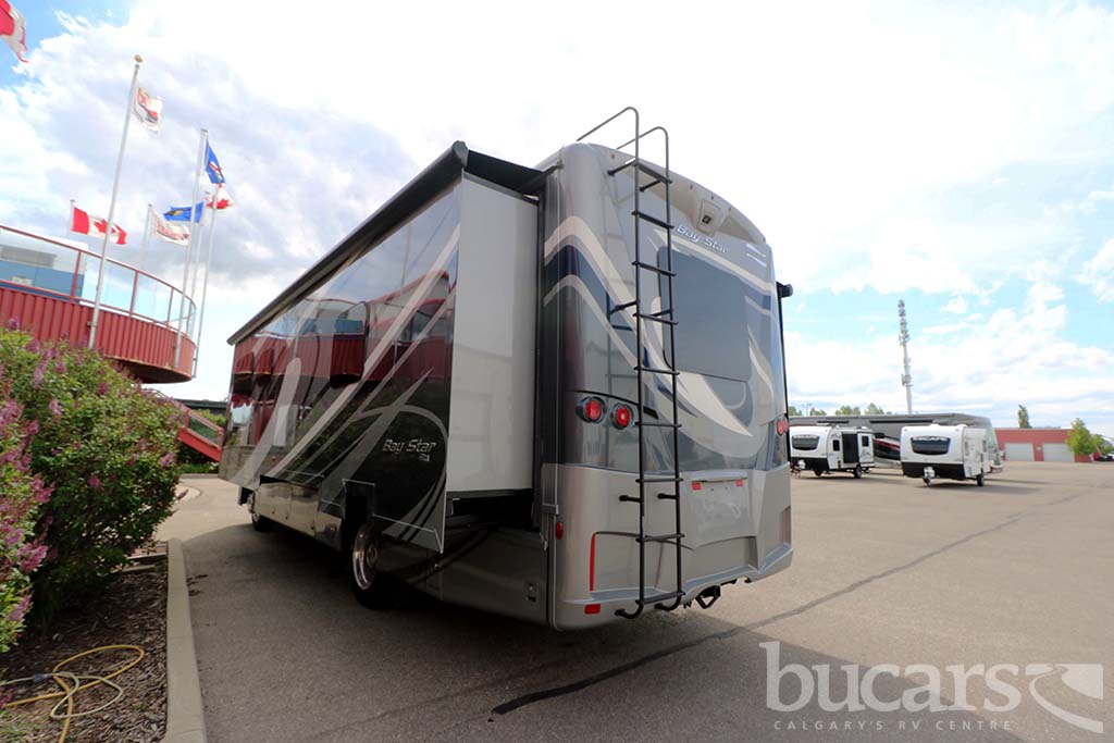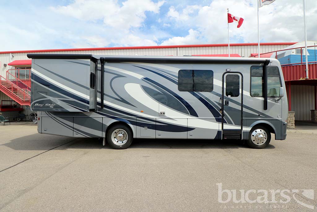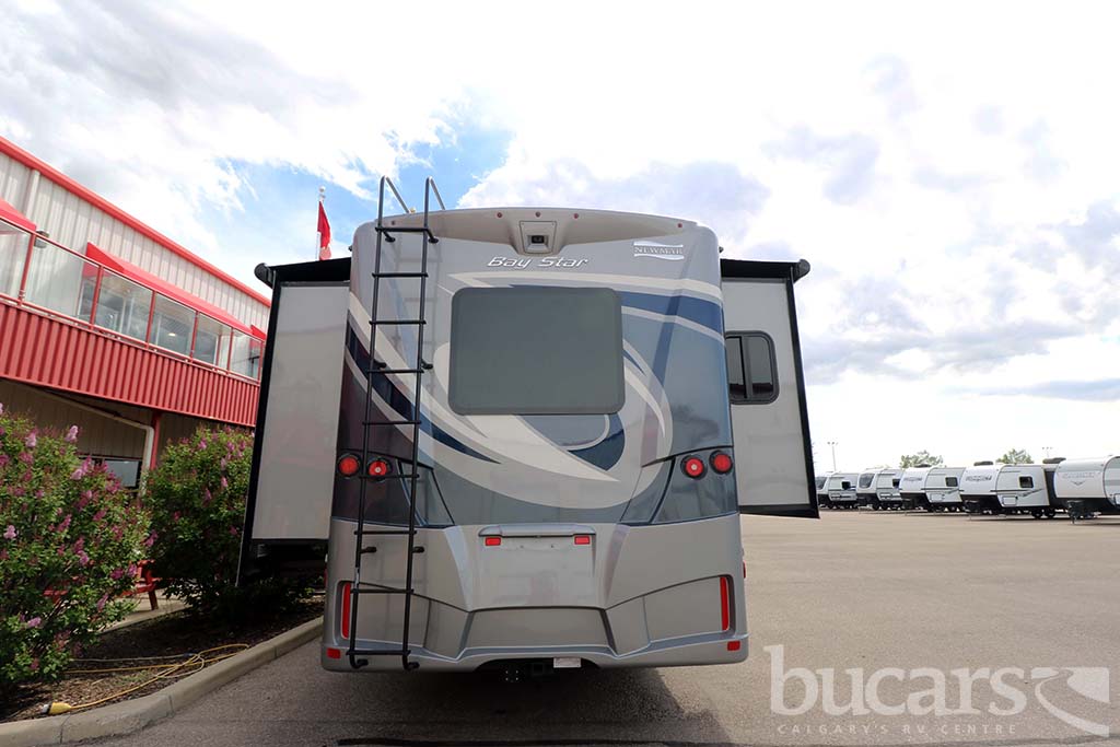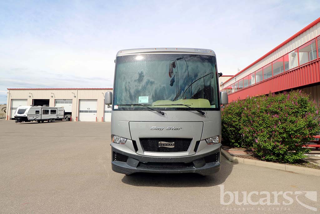 The 2021 Newmar Bay Star Sport 3014 Class A motorcoach features a Ford F-Series Chassis with a 7.8-liter V8 engine supplying 350 hp, campsite view booth dinette with entertainment center and under bench storage, Ultralux leather sofa and front seats with folding cockpit table, auxiliary heater in bedroom, queen sized walk around bed in slide with rear window and full wall wardrobe/entertainment center, skylight and fan in the bathroom, raised residential size refrigerator, 3 burner cooktop, convection microwave, solid surface countertops, rear ladder, solar prep, 13.5 Penguin Heat Pump A/C’s and 5.5 Onan Generator. For additional information on the 2021 Newmar Class A motorcoach please contact us at 1-800-267-8348, or come down and see this Bay Star Sport 3014 for yourself at our Balzac lot just north of Calgary. For all after hour sales inquiries call or text 403-710-8314, email sales247@bucarsrv.com or during business hours call or text 403-207-1666.