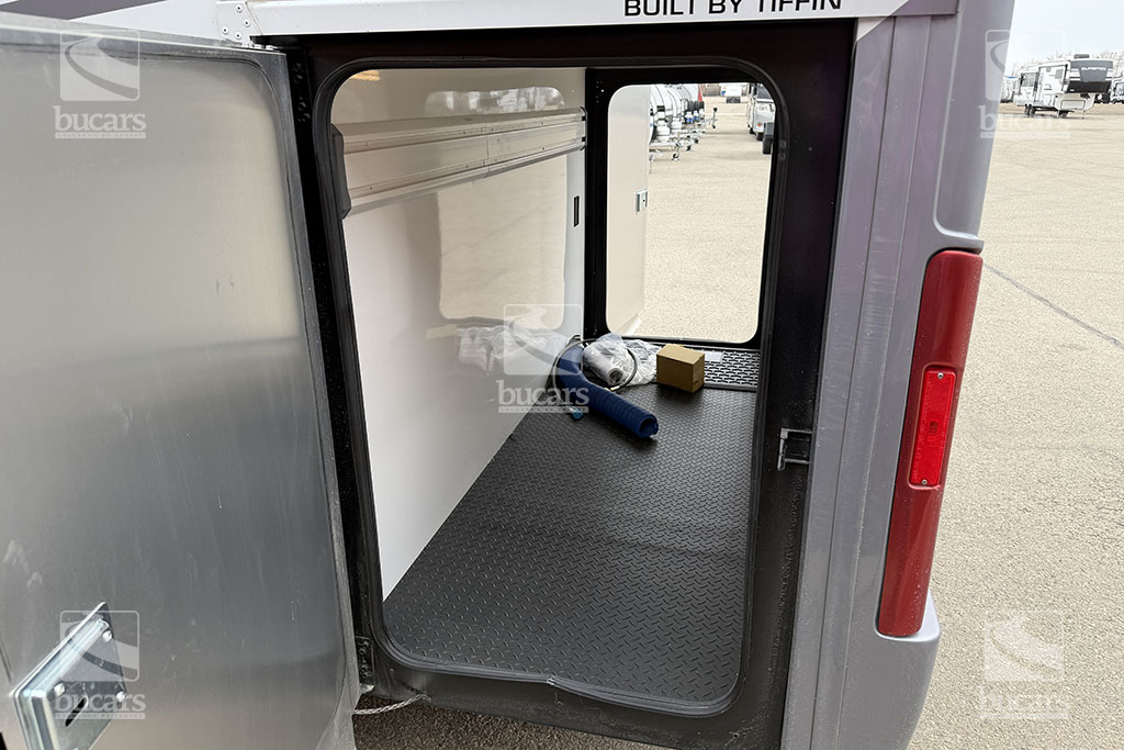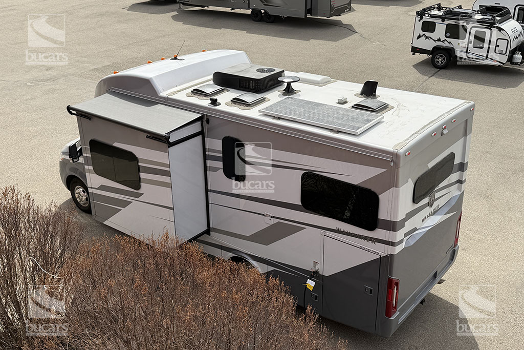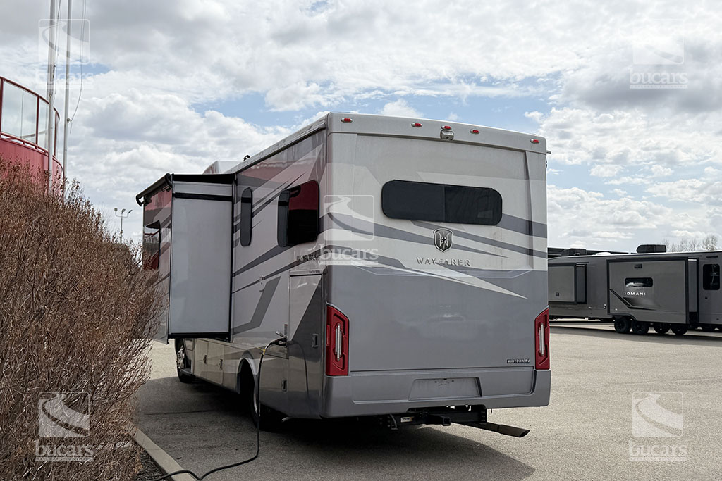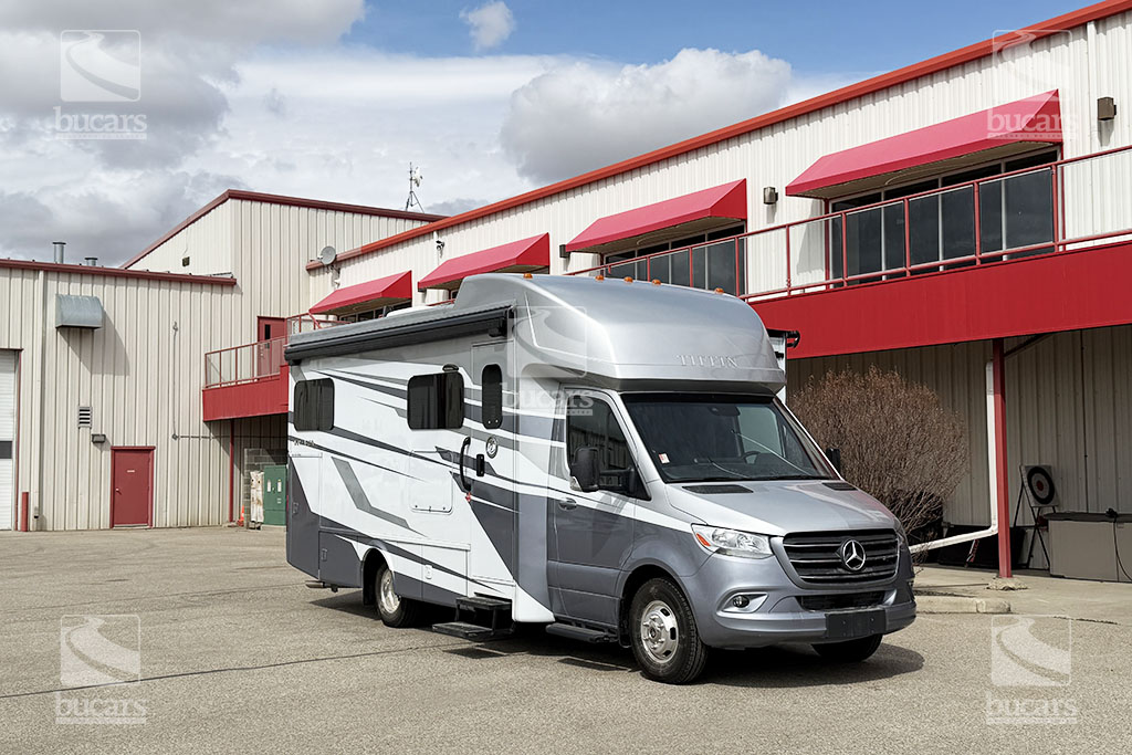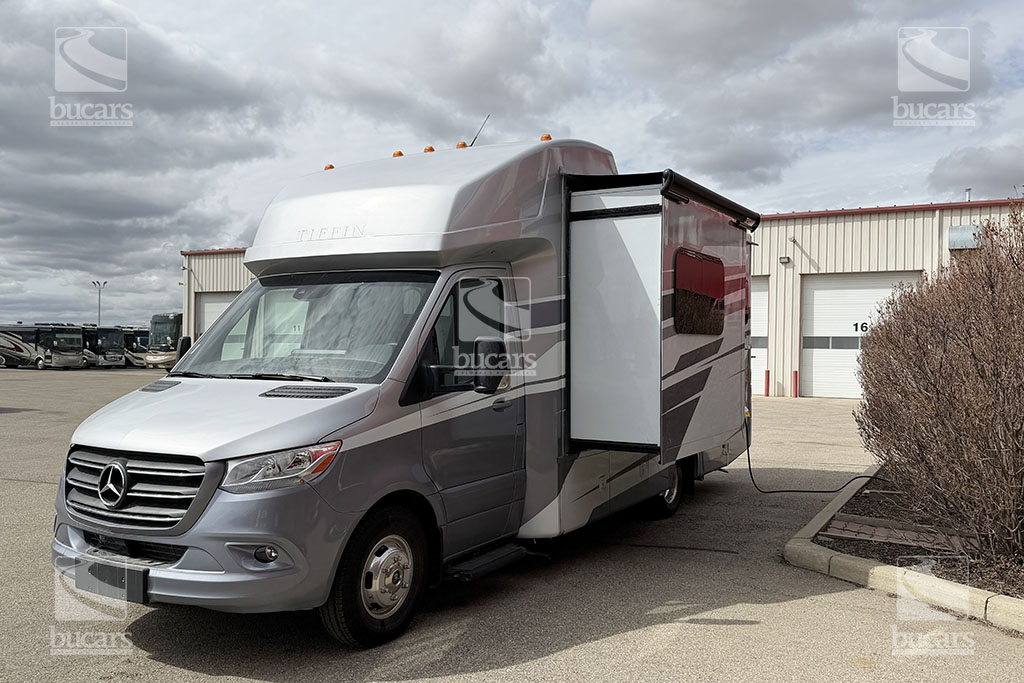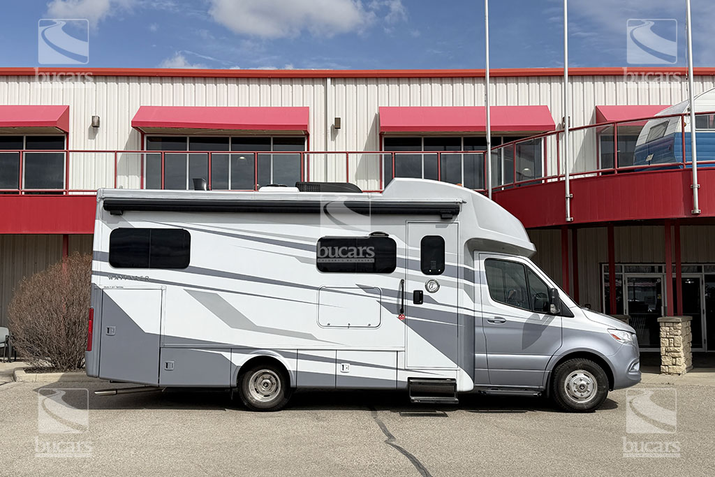 This 2025 Tiffin Wayfarer 25LW with stunning silver full-body paint is a luxurious class C motorhome on a Sprinter diesel chassis. This spacious Class C features a galley kitchen with stylish round sink, induction cooktop (including a set of pots & pans), microwave, and a convenient countertop extension. The TV is integrated into the kitchen for easy viewing from the theatre seating with swing-out table attachment. The bathroom is centrally located and features a large shower with space-saving roll-out door. The rear of this coach is a versatile sleeping area that can be configured as two twin beds or a large king ½ bed. There is an additional TV in the bedroom plenty of storage in the overhead cabinets and the innovative pop-up wardrobe. Kids or guests? No problem – there is a cozy cabover bunk with ladder. And the center of the bunk pops up to allow ample headroom getting in and out of the cockpit. The central vacuum helps you stay clean and tidy on the road and with the solar panels and onboard generator, you can stay off-grid even longer. And with the extra large pass-through storage in the rear, you can bring along all your gear. There is even an exterior TV so you can maximize your time in the great outdoors. Don’t miss out on this premium RV, designed for those who value both style and functionality on the road. For additional information on this luxurious Tiffin Wayfarer, please call or text our main line at 403-207-1666, or come down and see this class C motorhome for yourself at our Balzac lot just north of Calgary. For after-hour inquiries, please text us at 403-207-1666.
