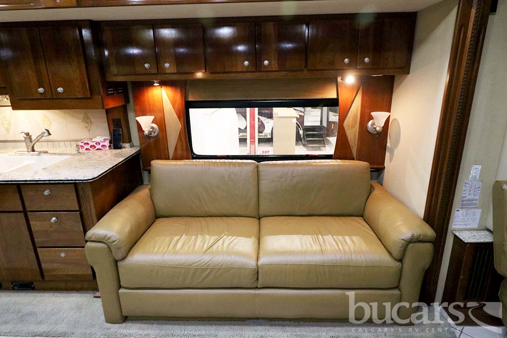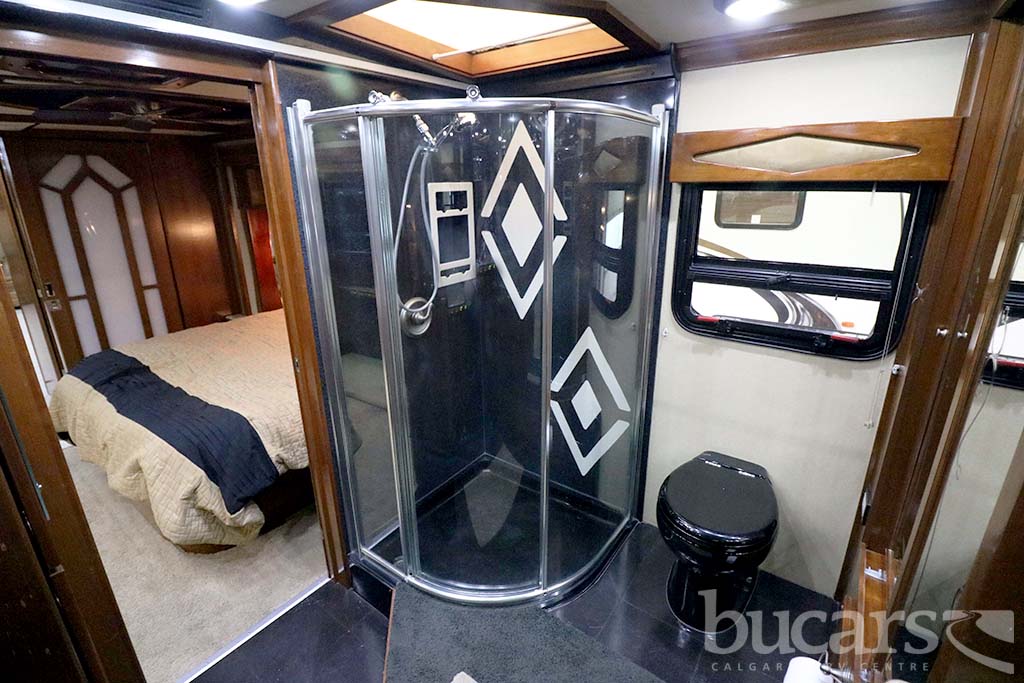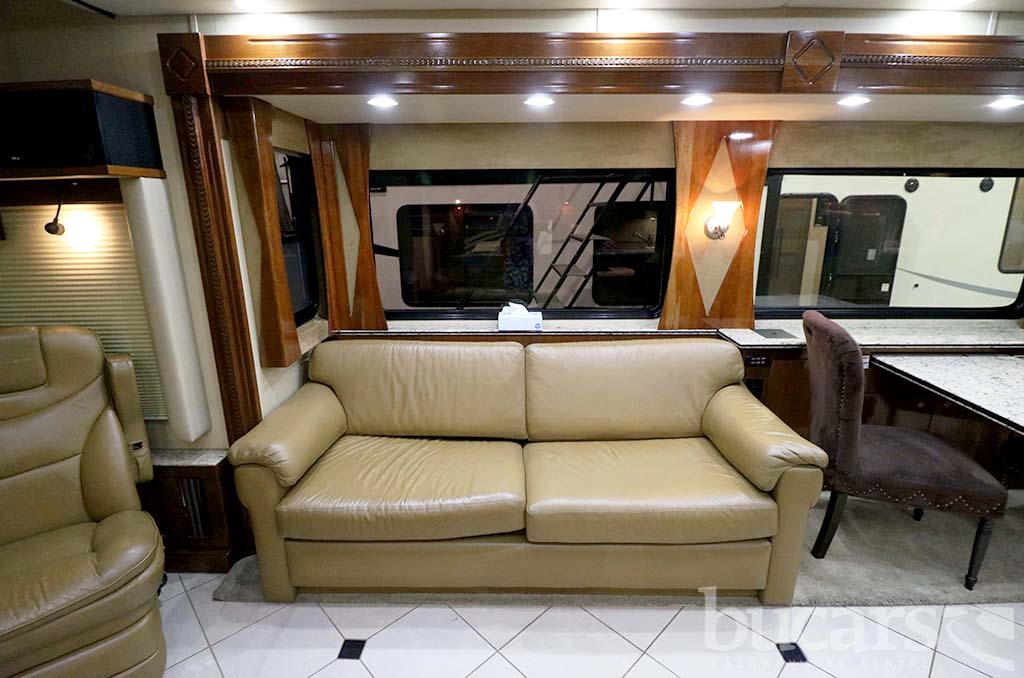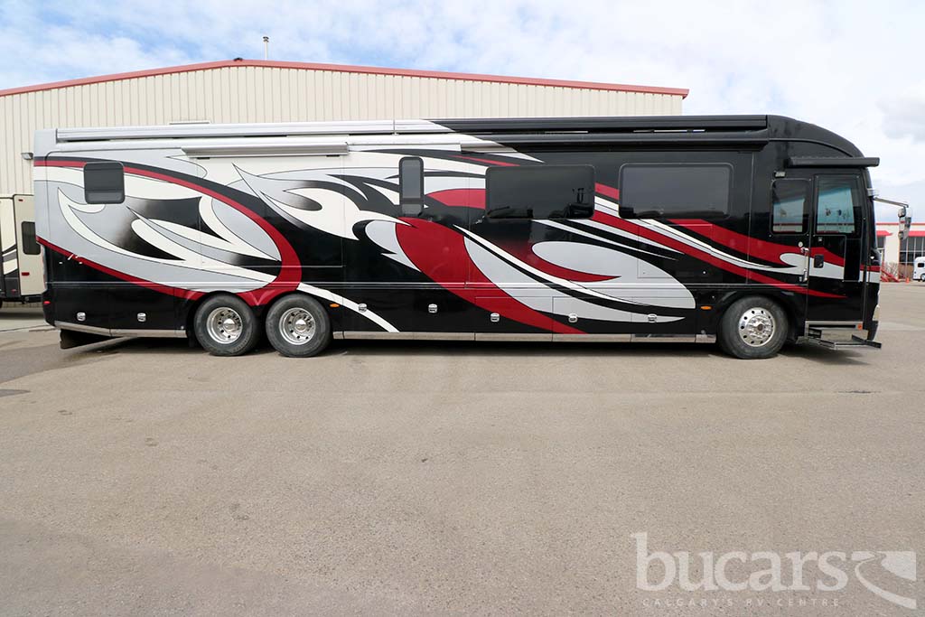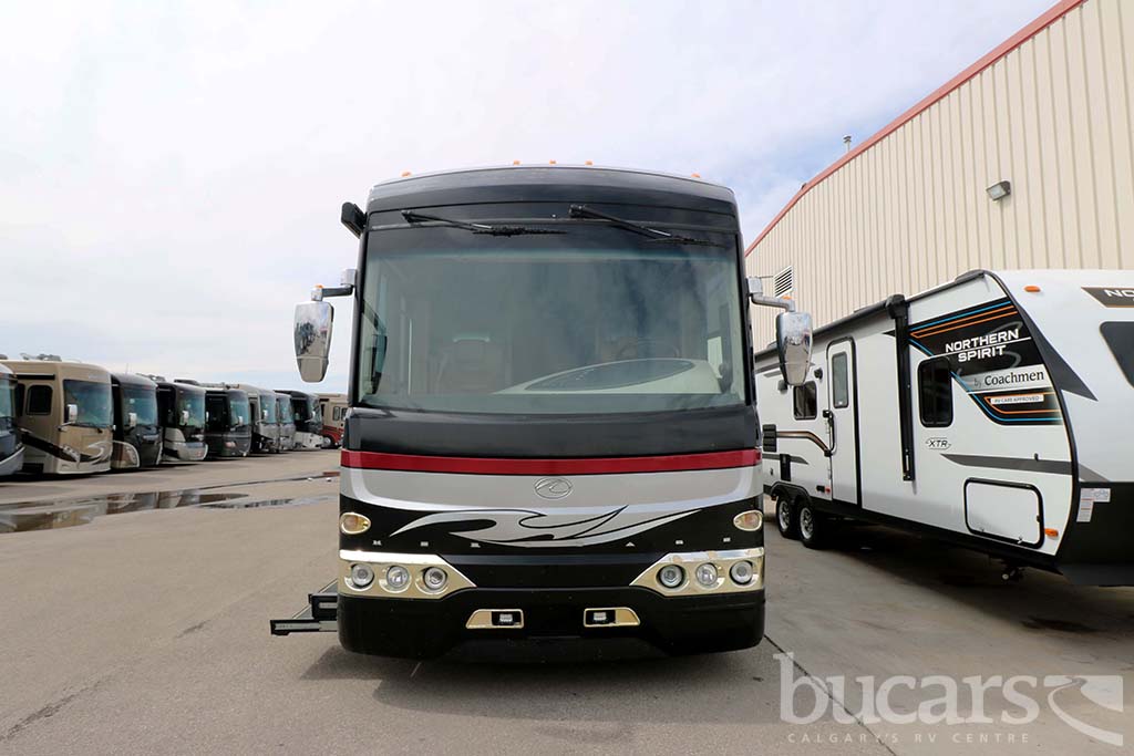 The 2008 American Coach Heritage 45B Class A Diesel motorhome features a Liberty Chassis with a 500Hp Cummins diesel engine Tag axle, independent front suspension, Aqua Hot heating, 2000 Watt inverter, 12 Kw generator, opposing sofa’s and buffet style table and chairs 2 fixed 2 folding, entertainment center and large kitchen, refrigerator with ice and water, convection microwave, midship half bath, king size walk around bed with full wall drawers and vanity, rear primary bath features a cedar lined closed and tons of storage, large glass enclosed shower with skylight, Girard Awning, Backup and sideview cameras, A/C and three slides. Approx. 272,000 KM’s. For additional information on the 2008 American Coach Diesel motorhome please contact us at 1-800-267-8348, or come down and see this Heritage 45B for yourself at our Balzac lot just north of Calgary. For all after hour sales inquiries call or text 403-710-8314, email sales247@bucarsrv.com or during business hours call or text 403-207-1666.