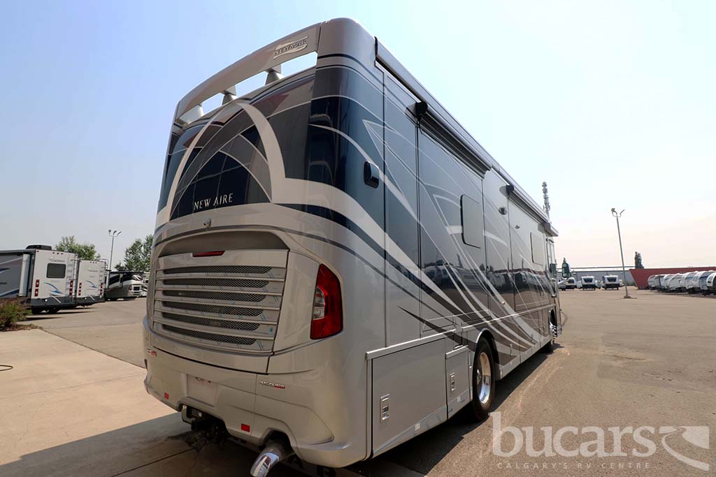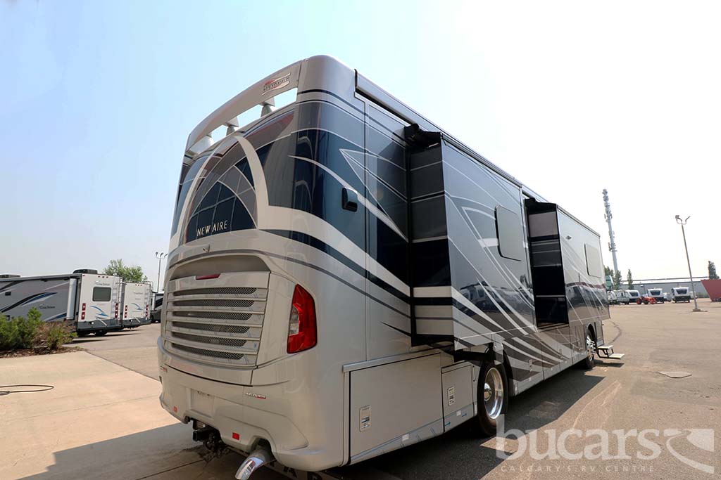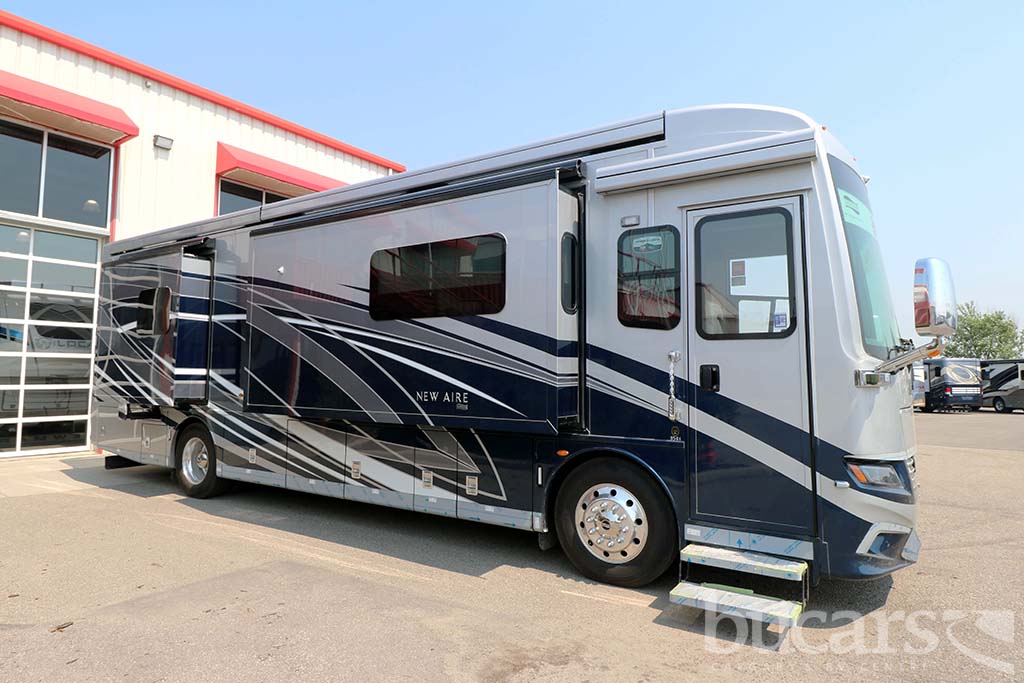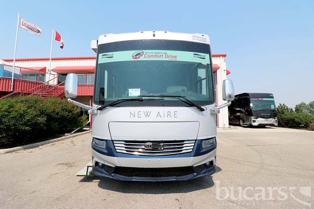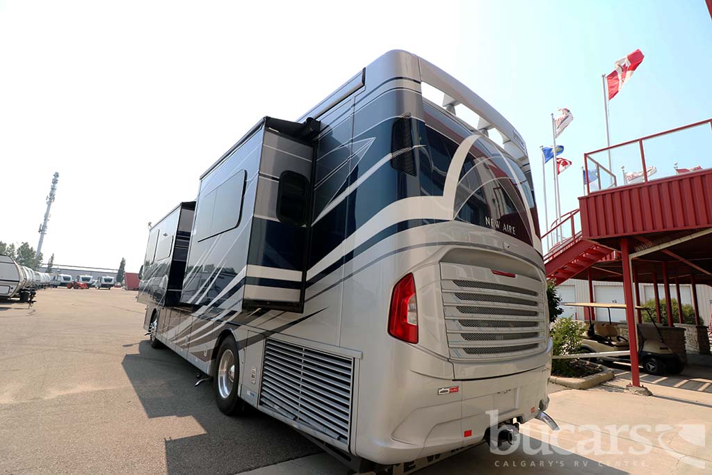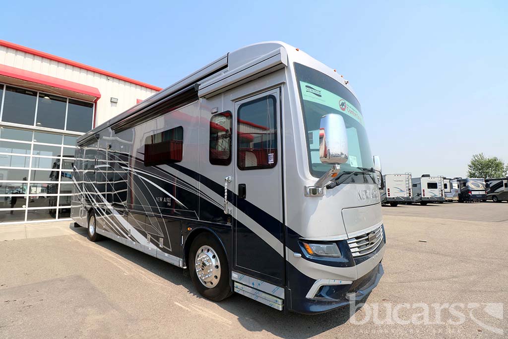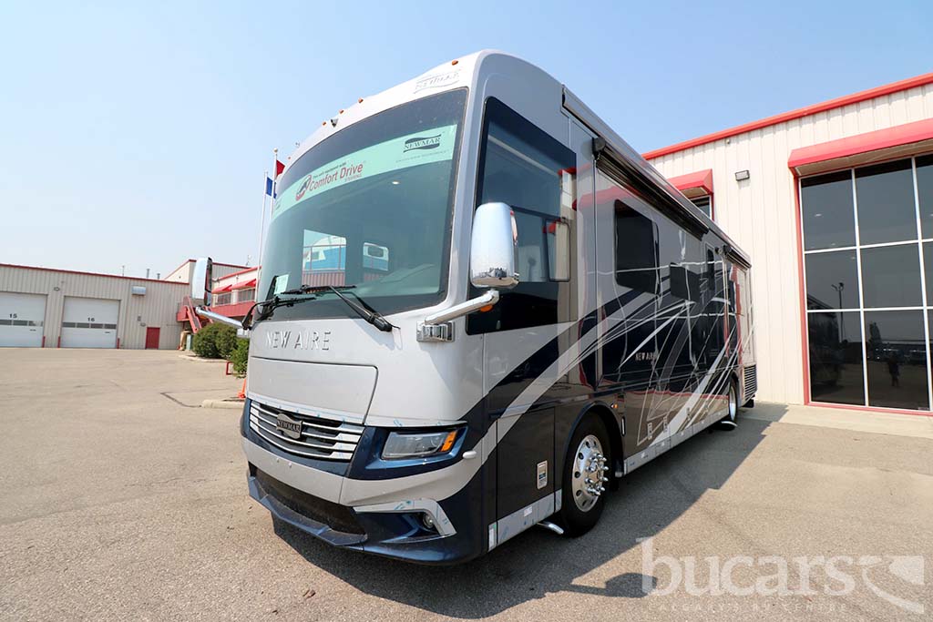 The luxurious 2021 Newmar New Aire 3541 Class A Diesel motorcoach features a Freightliner 450HP Cummins Diesel engine, 8.0 kw Cummins Onan Quiet Series diesel generator, Comfort drive adaptive steering system, Euro booth dinette/50 TV in televator with opposing sleeper sofa and two ottomans, reclining front swivel captains and passenger chairs that are 6 way adjustable and heated, residential 3 door refrigerator and ice maker, stainless steal undermount sink, all electric and portable induction cooktop, convection microwave, dishwasher, plush king size mattress with full wall wardrobe/stacked washer/dryer and full wall dressers with entertainment center, central vacuum with tool kit, electric radiant heat underneath tile, Xite HD 360 camera system with predictive grid lines & tri-view rear camera, Dometic freezer in under pull out drawer, 2 x pull out storage trays, Girard package with 2 x Nova side awnings and 2 x 15m Penguin Heat Pump Air Conditioners. For additional information on the 2021 Newmar Class A motorcoach please contact us at 1-800-267-8348, or come down and see this New Aire 3541 for yourself at our Balzac lot just north of Calgary. For all after hour sales inquiries call or text 403-710-8314, email sales247@bucarsrv.com or during business hours call or text 403-207-1666.