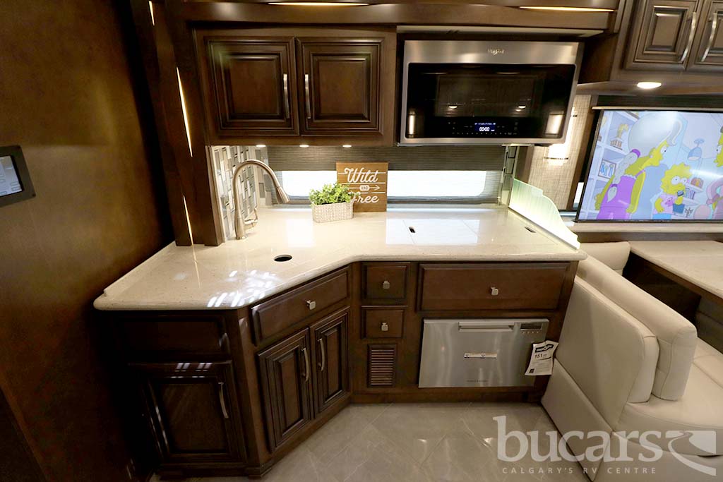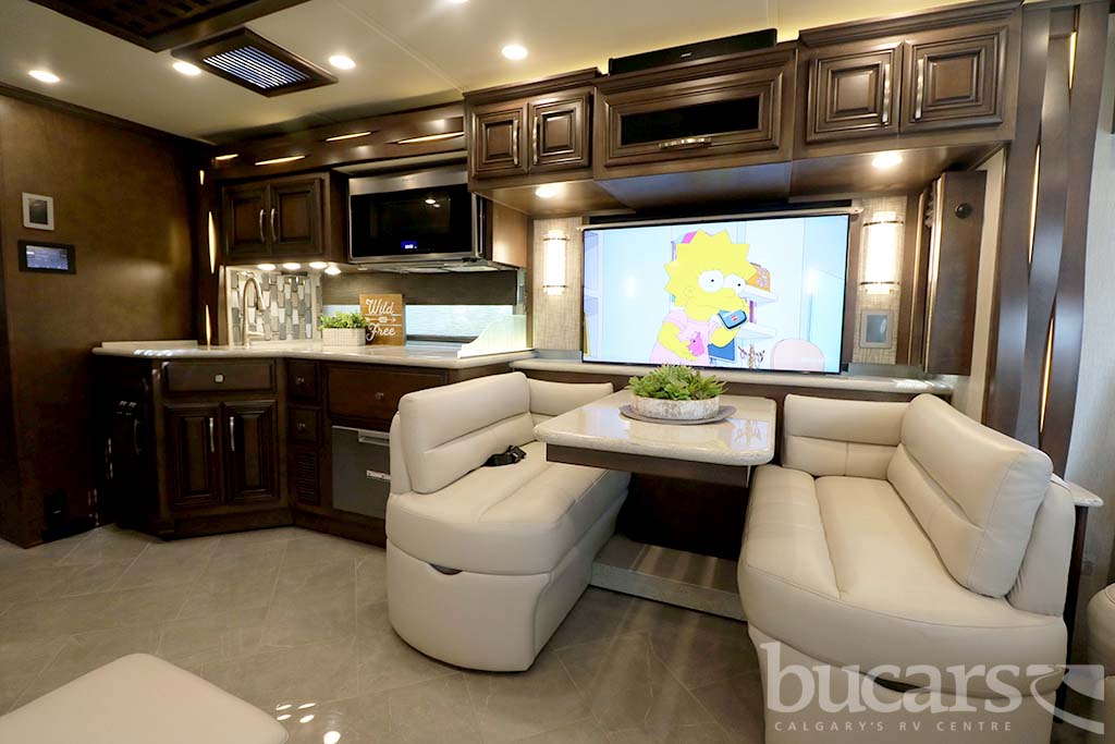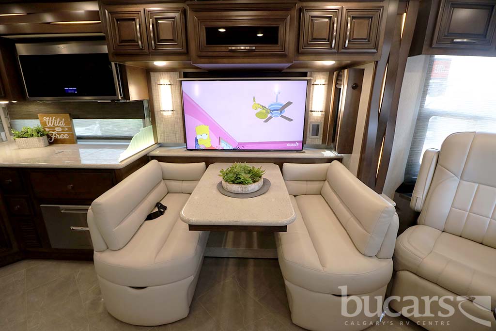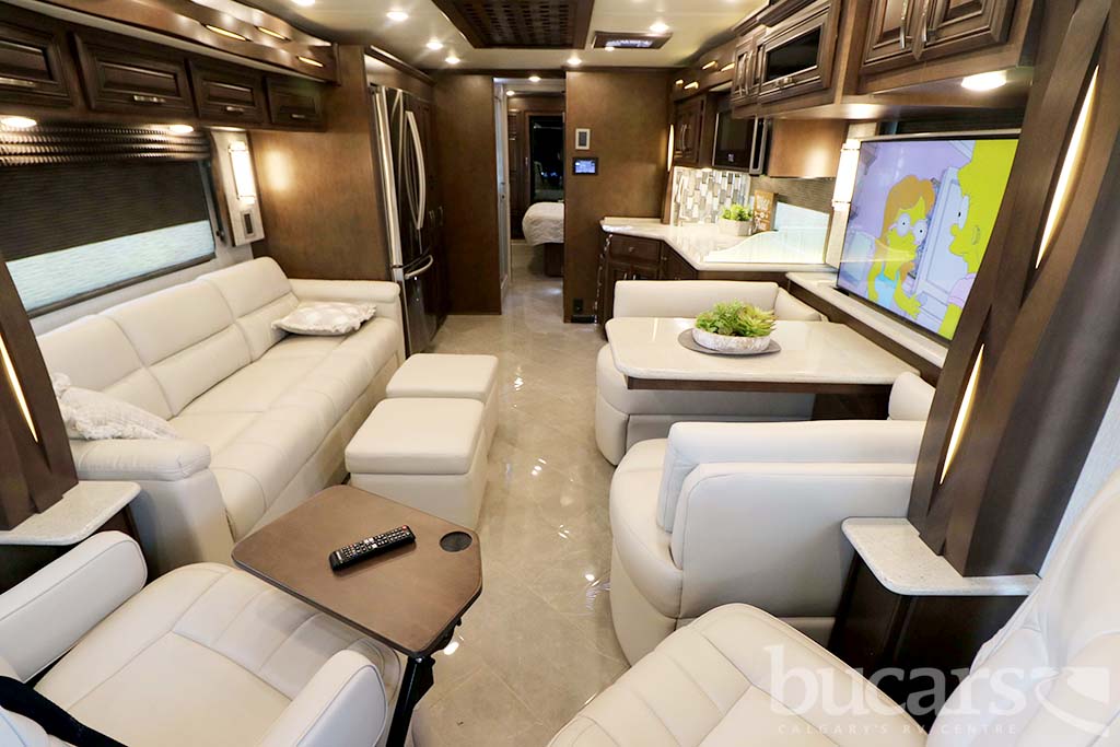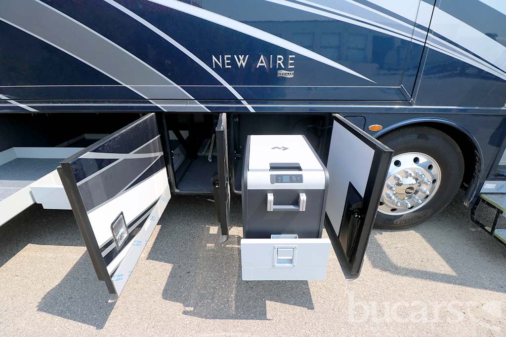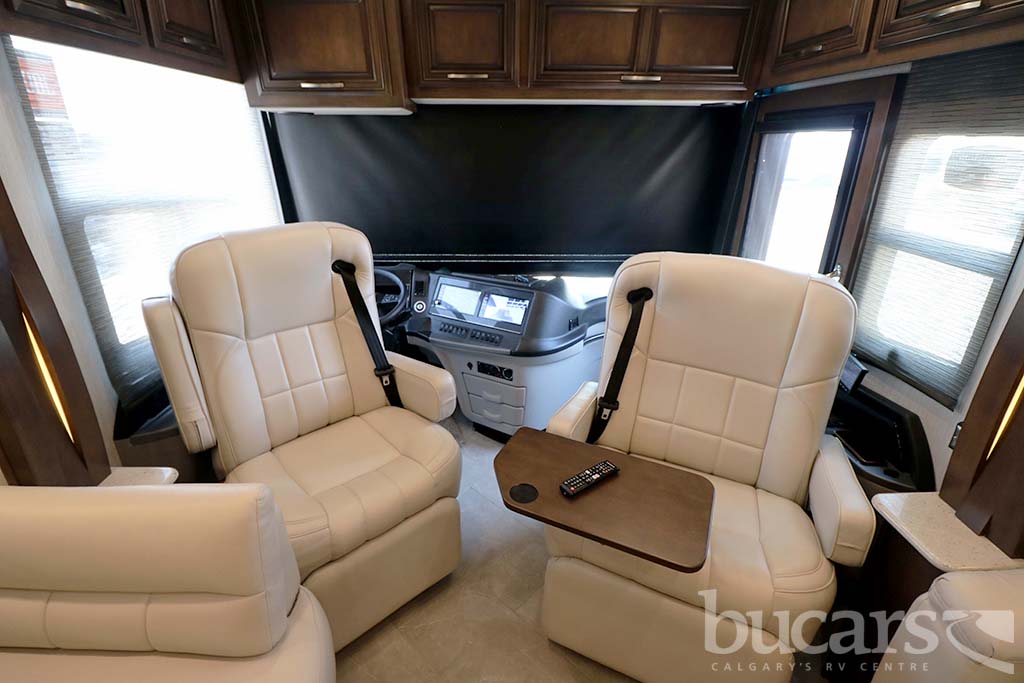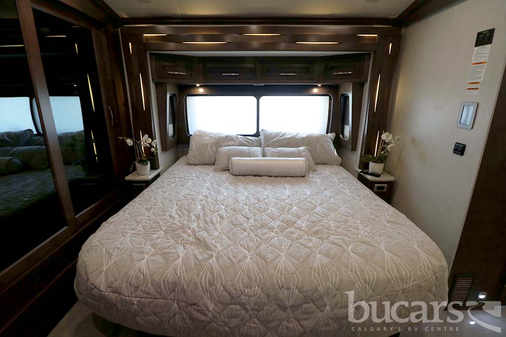 The luxurious 2021 Newmar New Aire 3541 Class A Diesel motorcoach features a Freightliner 450HP Cummins Diesel engine, 8.0 kw Cummins Onan Quiet Series diesel generator, Comfort drive adaptive steering system, Euro booth dinette/50 TV in televator with opposing sleeper sofa and two ottomans, reclining front swivel captains and passenger chairs that are 6 way adjustable and heated, residential 3 door refrigerator and ice maker, stainless steal undermount sink, all electric and portable induction cooktop, convection microwave, dishwasher, plush king size mattress with full wall wardrobe/stacked washer/dryer and full wall dressers with entertainment center, central vacuum with tool kit, electric radiant heat underneath tile, Xite HD 360 camera system with predictive grid lines & tri-view rear camera, Dometic freezer in under pull out drawer, 2 x pull out storage trays, Girard package with 2 x Nova side awnings and 2 x 15m Penguin Heat Pump Air Conditioners. For additional information on the 2021 Newmar Class A motorcoach please contact us at 1-800-267-8348, or come down and see this New Aire 3541 for yourself at our Balzac lot just north of Calgary. For all after hour sales inquiries call or text 403-710-8314, email sales247@bucarsrv.com or during business hours call or text 403-207-1666.
