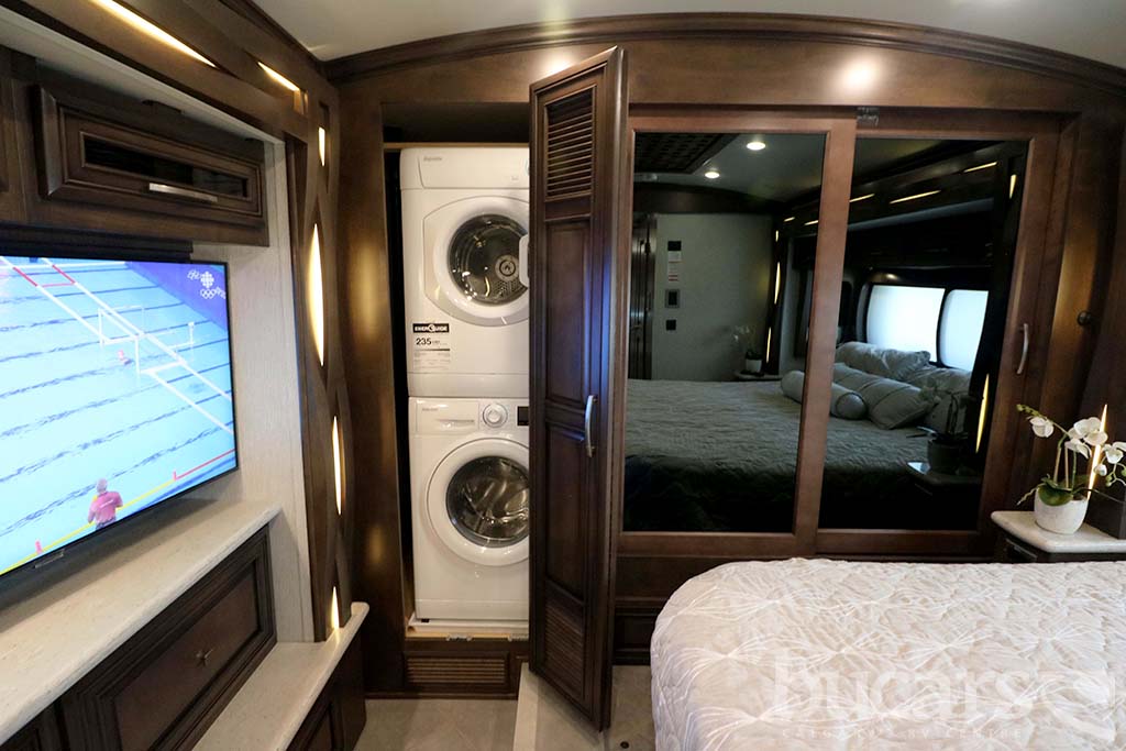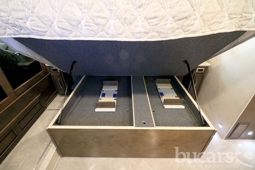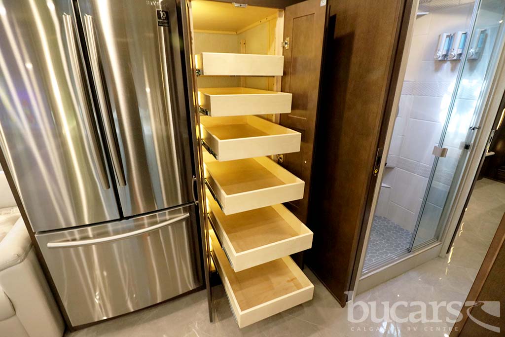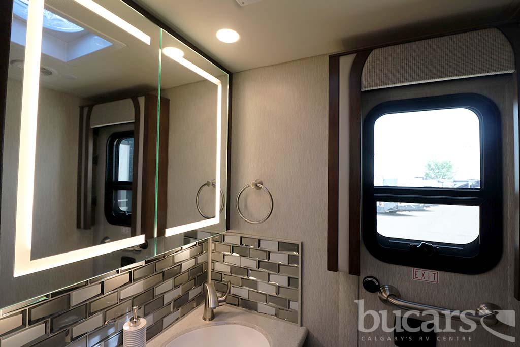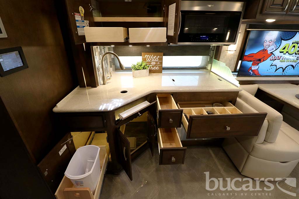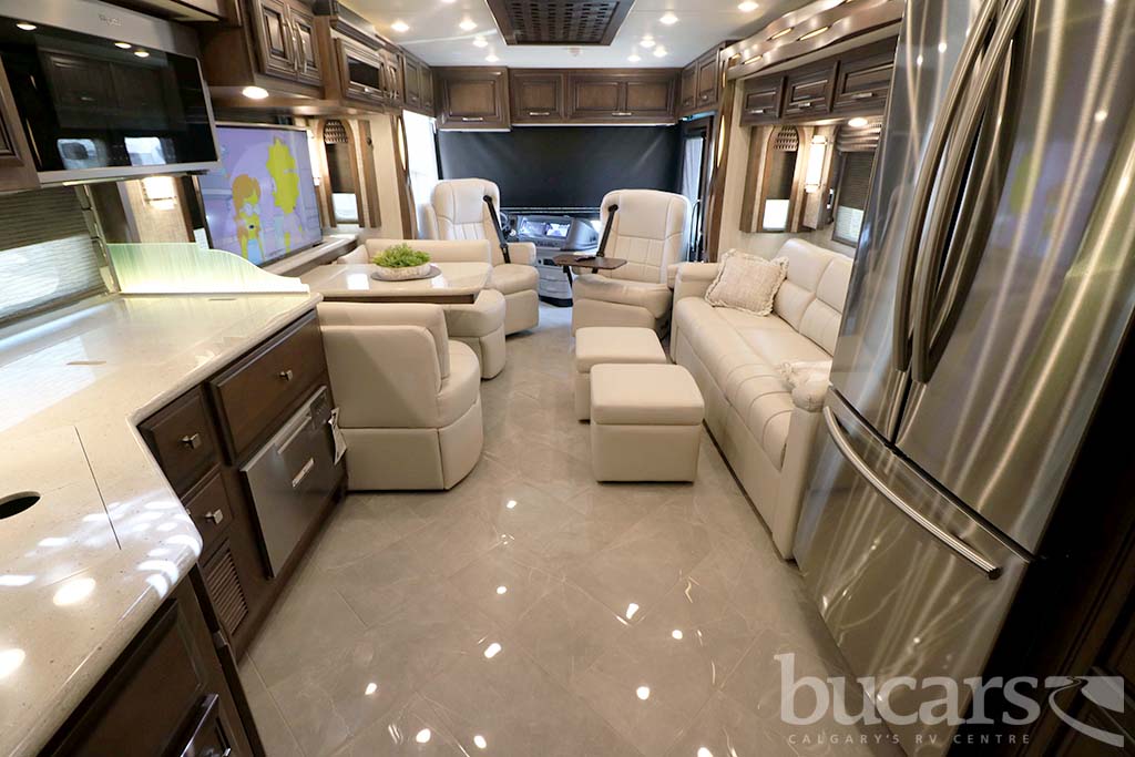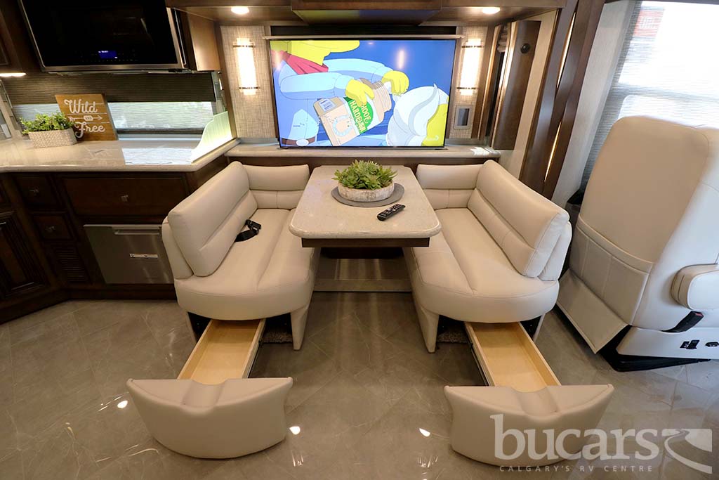 The luxurious 2021 Newmar New Aire 3541 Class A Diesel motorcoach features a Freightliner 450HP Cummins Diesel engine, 8.0 kw Cummins Onan Quiet Series diesel generator, Comfort drive adaptive steering system, Euro booth dinette/50 TV in televator with opposing sleeper sofa and two ottomans, reclining front swivel captains and passenger chairs that are 6 way adjustable and heated, residential 3 door refrigerator and ice maker, stainless steal undermount sink, all electric and portable induction cooktop, convection microwave, dishwasher, plush king size mattress with full wall wardrobe/stacked washer/dryer and full wall dressers with entertainment center, central vacuum with tool kit, electric radiant heat underneath tile, Xite HD 360 camera system with predictive grid lines & tri-view rear camera, Dometic freezer in under pull out drawer, 2 x pull out storage trays, Girard package with 2 x Nova side awnings and 2 x 15m Penguin Heat Pump Air Conditioners. For additional information on the 2021 Newmar Class A motorcoach please contact us at 1-800-267-8348, or come down and see this New Aire 3541 for yourself at our Balzac lot just north of Calgary. For all after hour sales inquiries call or text 403-710-8314, email sales247@bucarsrv.com or during business hours call or text 403-207-1666.