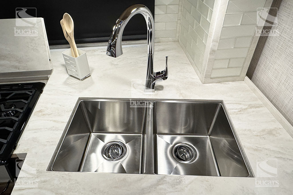 - Polished Solid Surface Countertop in Kitchen with Under Mounted Stainless Steel Sink and Sink Covers