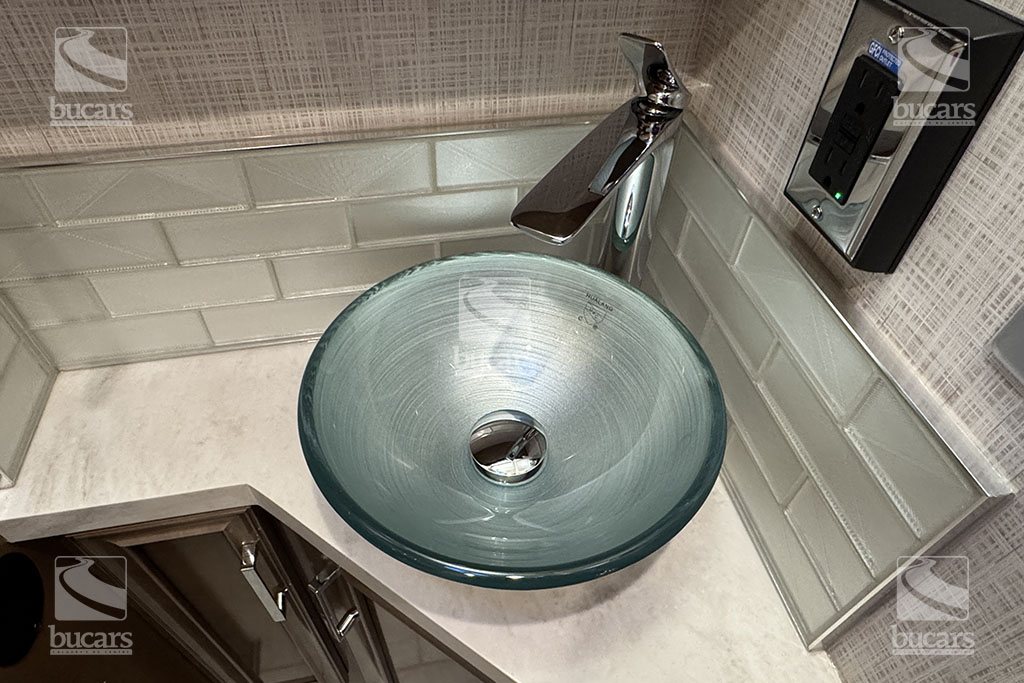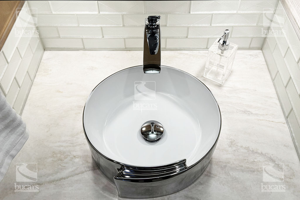- Polished Solid Surface Countertop in Bathroom and Bedroom