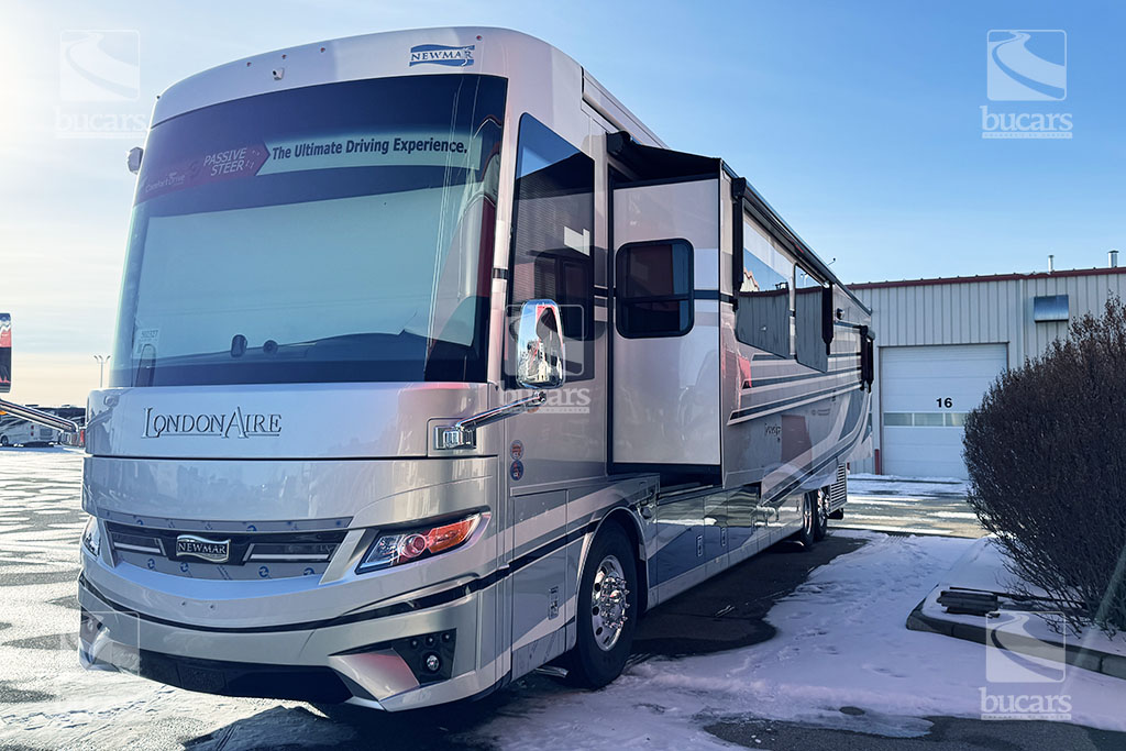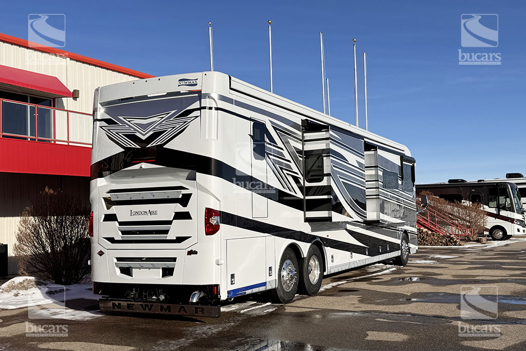 The 2026 London Aire 4551 Class A Diesel Motorhome sets a new standard in luxury RV travel, combining exquisite design with state-of-the-art technology. This luxurious motorhome is a true head-turner in stunning full custom paint with bold graphics. It is designed with discerning RV enthusiasts in mind, blending traditional design elements with Newmar’s legendary craftsmanship. Built on a Spartan K3 tag axle chassis, it is an impressive entry point to 605 HP in the Newmar luxury lineup, and has 20,000 towing capacity. This fully-loaded coach delivers refined full-grain leather upholstery on all seating including the power extenda-flex dinette, power storage trays, stainless steel baggage door trim, chest freezer in basement, exterior TV, and is prepped to add Starlink. Inside, you will find a host of modern conveniences including a dishwasher, stacked washer & dryer, TV on lift, and theatre seating. The secluded rear bedroom will be your haven with it’s King bed, additional TV, and plenty of storage. The rear bathroom is both beautiful and functional with double matte black sink bowls, power flush toilet, and massive glass shower with seat and assist bar. There is an additional central half-bath for added convenience.