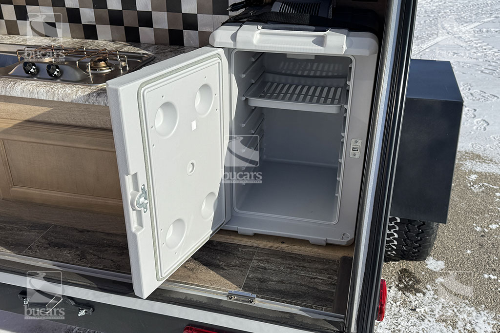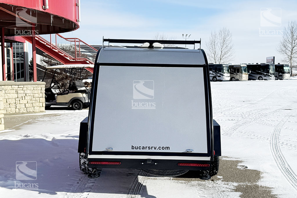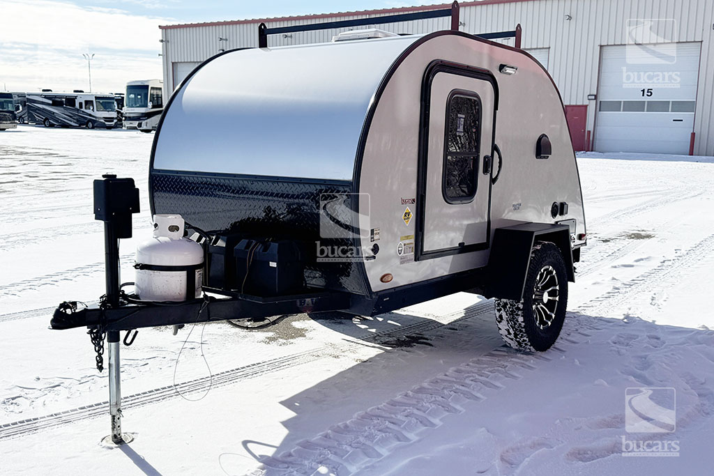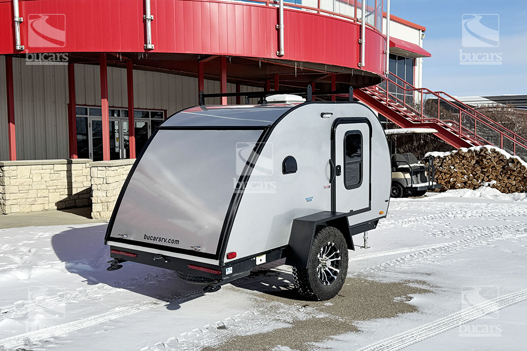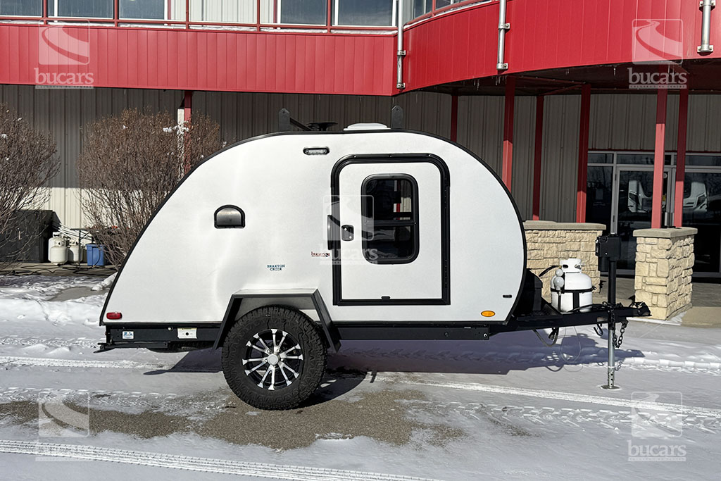 This 2020 Braxton Creek Bushwhacker 10FB is a tiny teardrop travel trailer weighing only 1,300 pounds. Inside this streamlined silver trailer with a retro look, you will find sleeping area for 2 people, a furnace, and air conditioner. This rugged trailer featuring off-road tires and a roof rack is ready for adventure. Lift open the rear hatch and you will find an outdoor kitchen with sink, two-burner cooktop, and electric cooler. This unique teardrop is perfect for couples or solo campers who are looking for an uncomplicated way to enjoy the outdoors. For additional information on this Bushwhacker, please call or text our main line at 403-207-1666, or come down and see this compact teardrop trailer for yourself at our Balzac lot just north of Calgary. For after-hour inquiries, please text us at 403-207-1666.