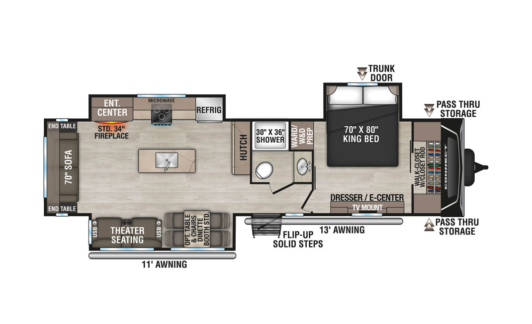 - KZ Engage: Powered by OneControl (monitors: battery levels, controls: slide rooms, leveling system, awning(s), inside/outside lighting, TPMS prep)