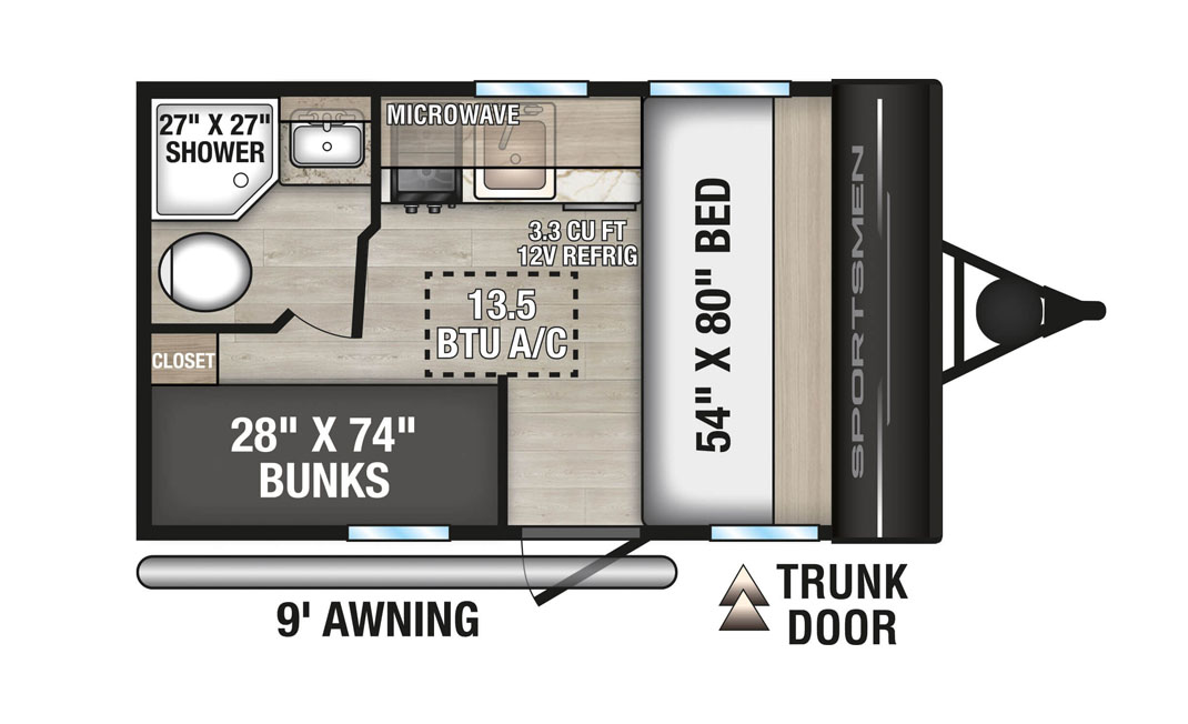 ** Stock photo for representation purposes only. Actual photos will be added when the unit arrives from factory. The 2026 K-Z Sportsmen Classic 130BH, the most compact in the Sportsmen Classic lineup, is a cozy and uncomplicated family travel trailer. This lightweight, single axle trailer has everything you need for a memorable camping trip including a bed in the nose, kitchen with 3.3 cubic ft 12 volt refrigerator, two-burner cooktop, and microwave, stacked bunks, and three-piece bathroom at the rear. All of this usable space is accomplished without a slideout. For additional information on this Sportsmen Classic, please call or text our main line at 403-207-1666, or come down and see this sturdy travel trailer for yourself at our Balzac lot just north of Calgary. For after-hour inquiries, please text us at 403-207-1666.