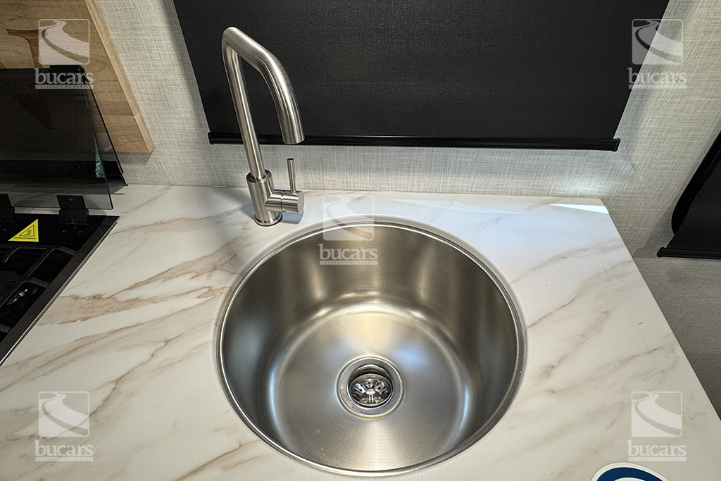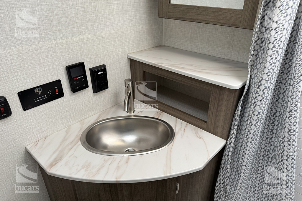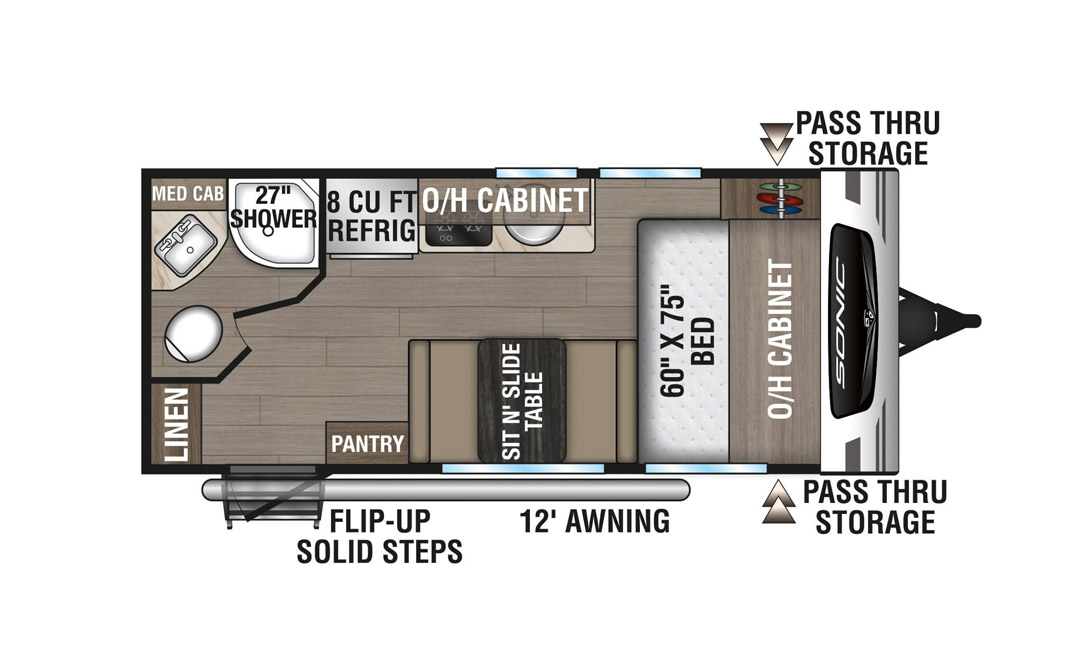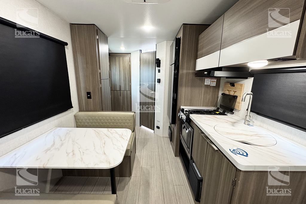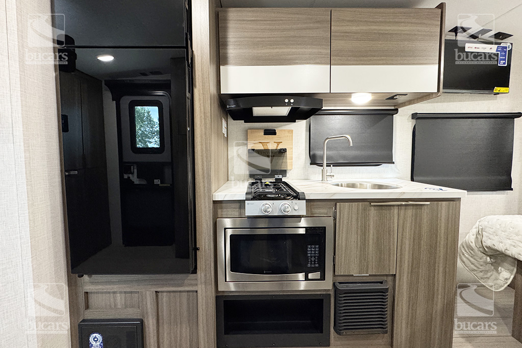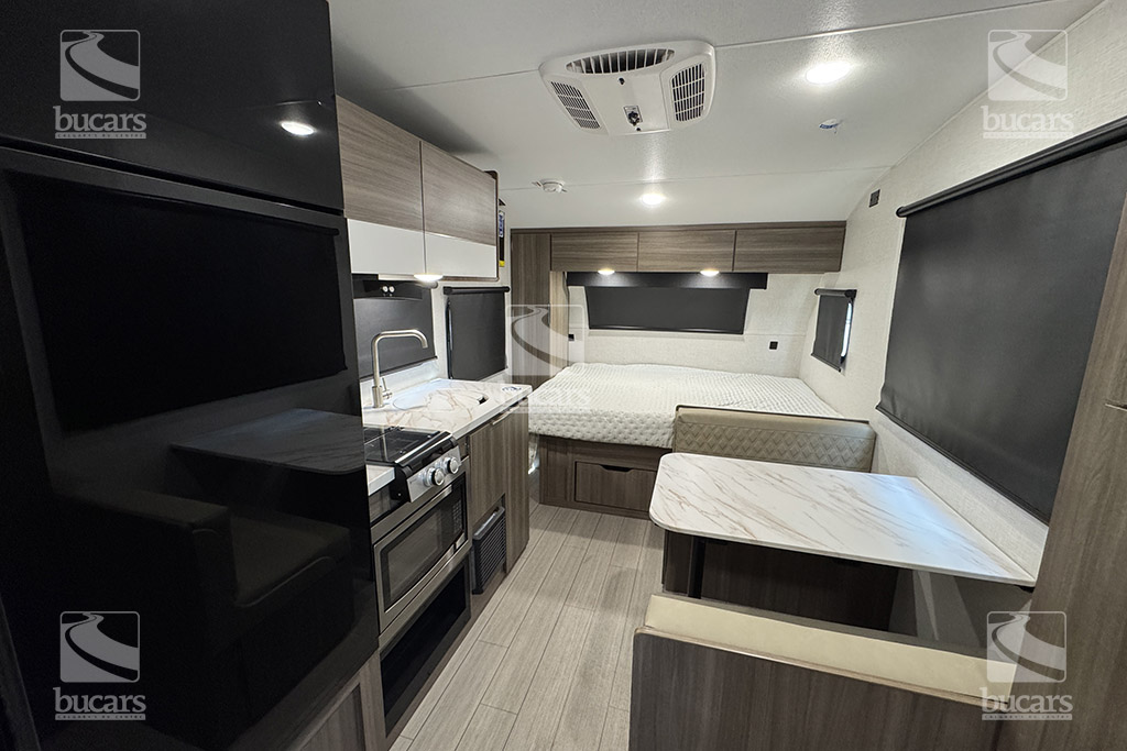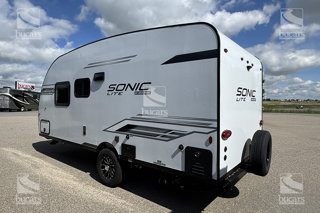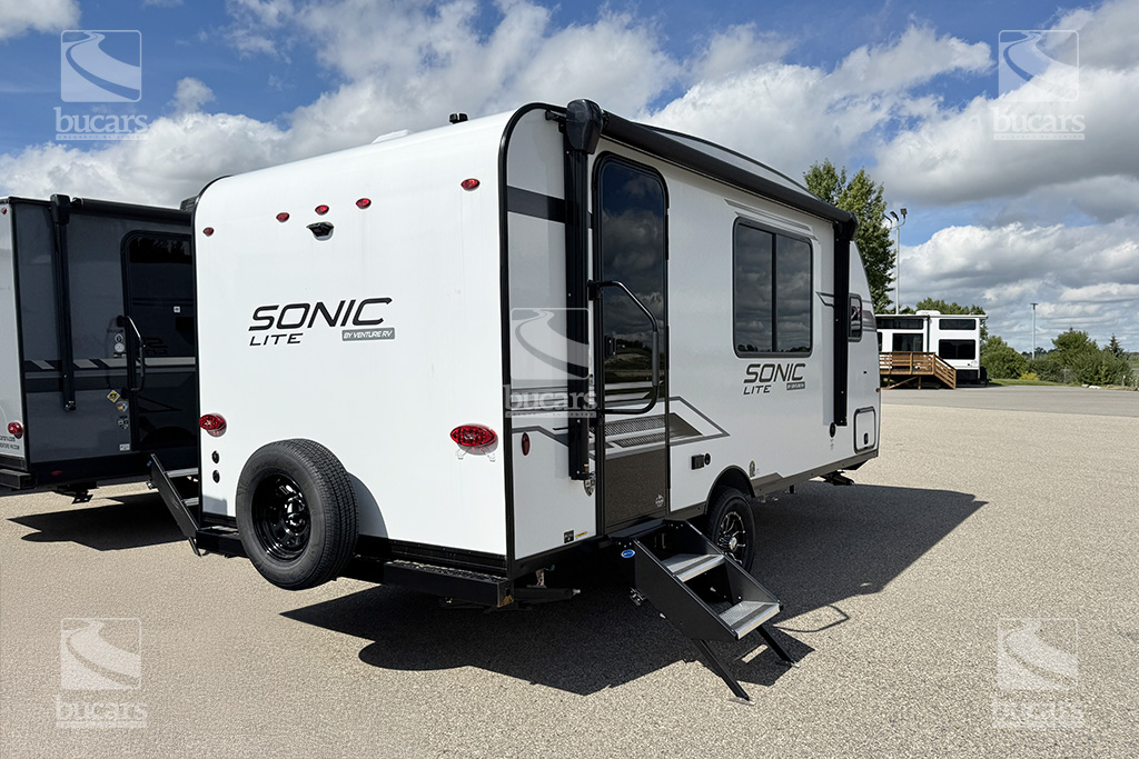The 2026 Venture RV Sonic Lite 160VFB is a compact, lightweight, modern couple’s retreat! This fibreglass-walled travel trailer has a dry weight of only 3,380 lbs, measures in at just over 21 feet long, and sleeps 3 people. All of this is accomplished with no slideouts. The kitchen located across from the dinette features a 12v refrigerator, two-burner cooktop, and stylish round sink with cover. The bed and TV are in the nose, nestled under the front window. The three-piece bathroom is conveniently located in the rear of the trailer. This well-constructed unit has an on-demand hot water heater and plenty of storage inside and out. For more information on this Venture Sonic Lite, please call us at 1-800-267-8348 or come down and see this lightweight couple’s travel trailer at our Balzac lot just north of Calgary. For all after hour sales inquiries call or text 403-710-8314, email sales247@bucarsrv.com or during business hours call or text 403-207-1666.
