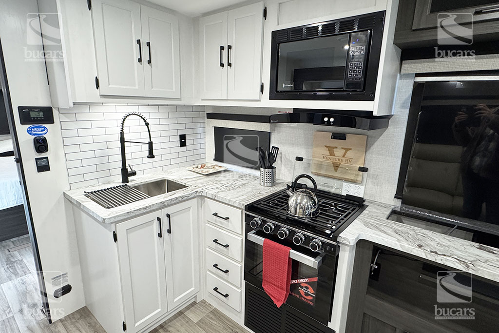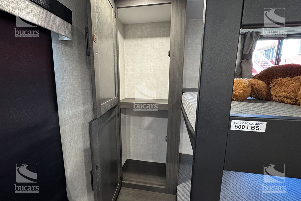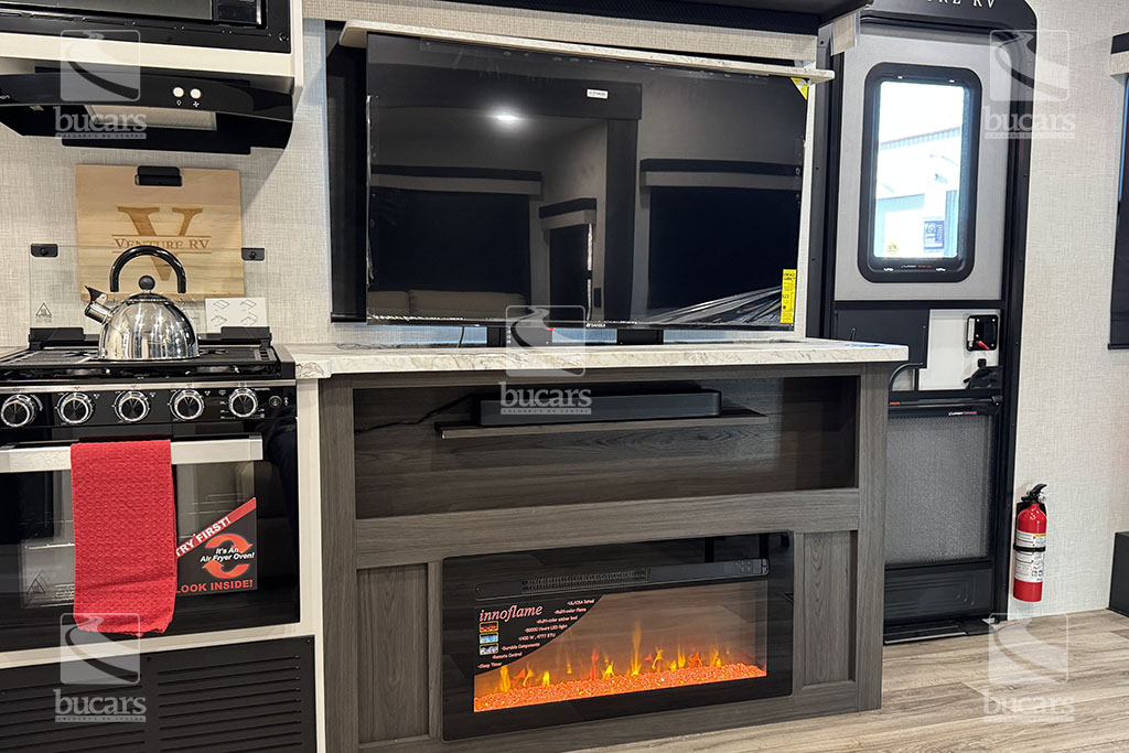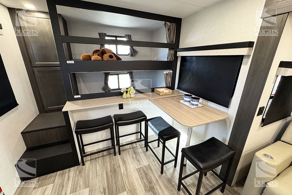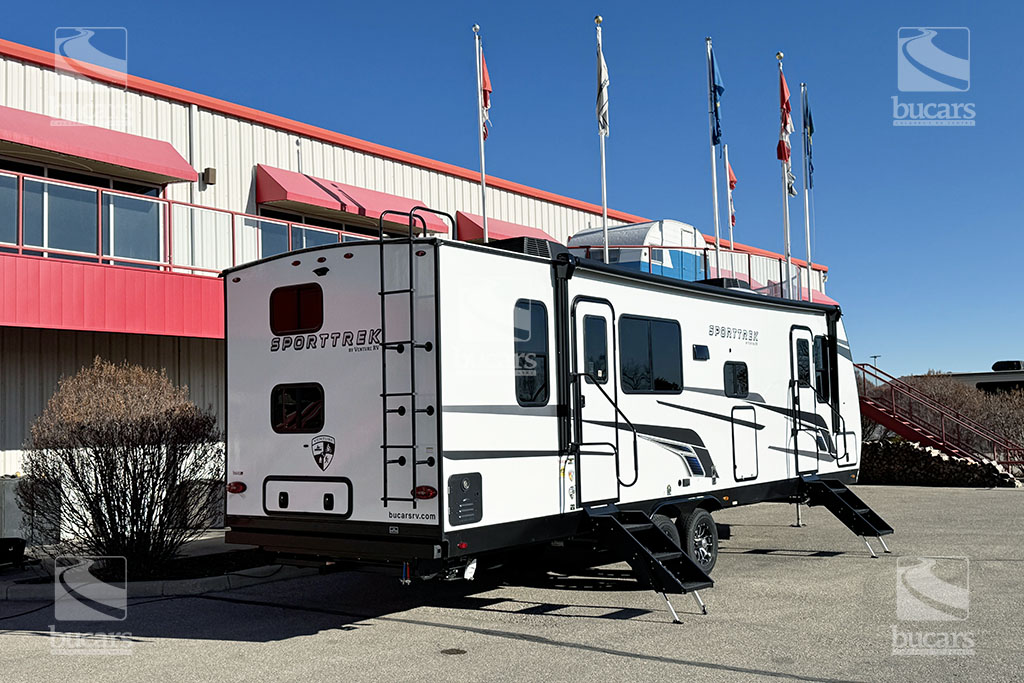 This all-new for 2026 Venture Sporttrek 271VBH is a family camping dream! The unique floorplan features a flexible dining area with barstool seating and a high-top table that slides for easy access and maximum versatility. The stacked bunks in the rear come with plenty of storage nearby. The corner kitchen is bright and modern, and is stocked with high-end appliances, and features an extra-large pantry next to the 12-V refrigerator with bottom pull-out freezer. The theatre seating with heat/massage, and storage console face the entertainment area featuring a TV on power lift and cozy fireplace. The central bathroom is easily accessed, and the bedroom with Queen bed, large front window, and dedicated A/C unit has it’s own private front entrance. The solar panel is a great addition to power your adventures. Your family will love making memories in this beautiful travel trailer. For additional information on this 2026 Venture Sporttrek, please contact us at 1-800-267-8348, or come down and see this all-new 271VBH bunk model for yourself at our Balzac lot just north of Calgary. For after-hour inquiries, please text us at 403-207-1666.