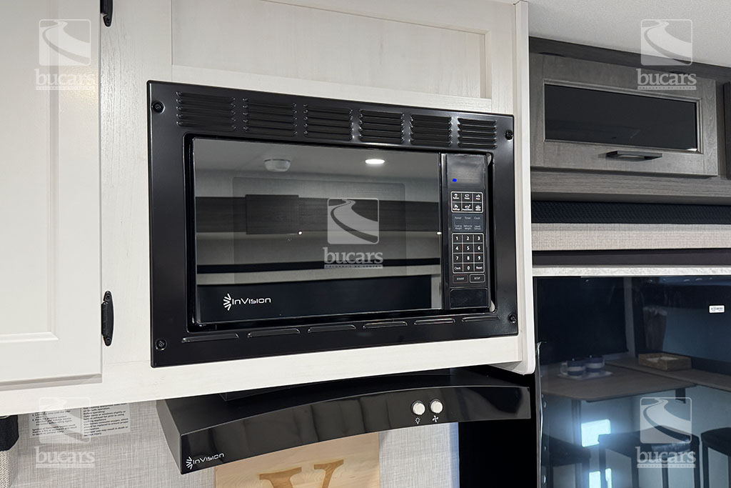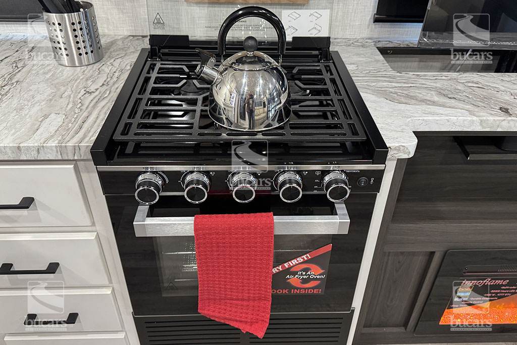- Furrion oven & 3-burner cooktop w/flush-glass cover