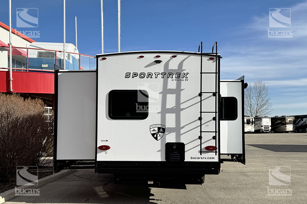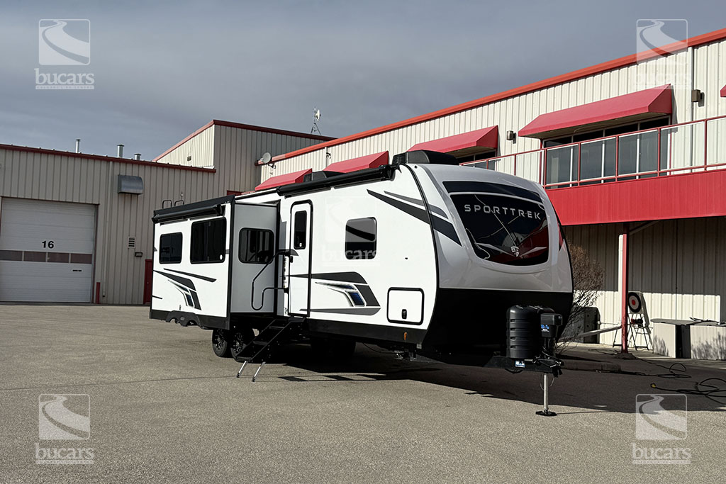 The 2026 Sporttrek 327VIK is our best-selling floorplan and the perfect travel trailer for your familys adventure-filled getaways. Setting up camp is quick and easy with the BAL 5.1 electric stabilizer system, and you can enjoy camping off-grid with a 200 watt solar package! The kids will enjoy their own private bunkhouse. The flip-up bunk over the sofa offers extra flexibility for seating and storage. The exterior kitchen is a fun way to prepare meals in the great outdoors and when the weather doesnt cooperate, retreat under the dual power awnings or inside to your cozy entertainment, complete area with electric fireplace. The island kitchen is so spacious, that cooking up gourmet meals is a breeze! At the end of a fun-filled day, youll sleep well in the comfortable queen size bed. For additional information on this Venture Sporttrek, please call or text our main line at 403-207-1666, or come down and see this family travel trailer for yourself at our Balzac lot just north of Calgary. For after-hour inquiries, please text us at 403-207-1666.