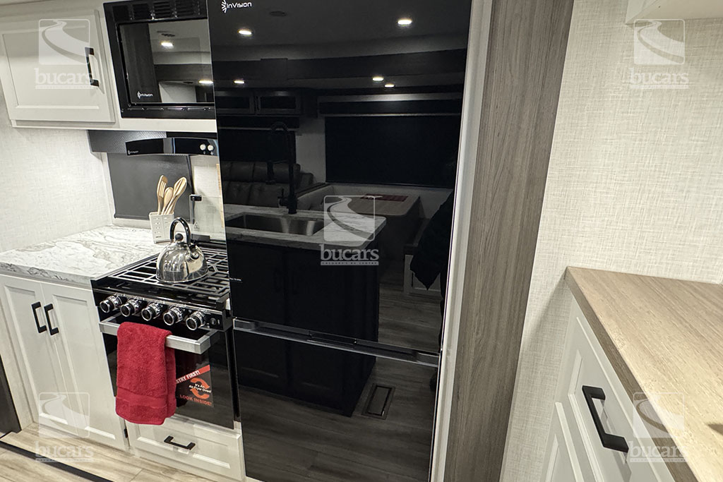 - Furrion oven & 3-burner cooktop w/flush-glass cover